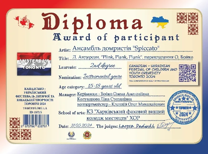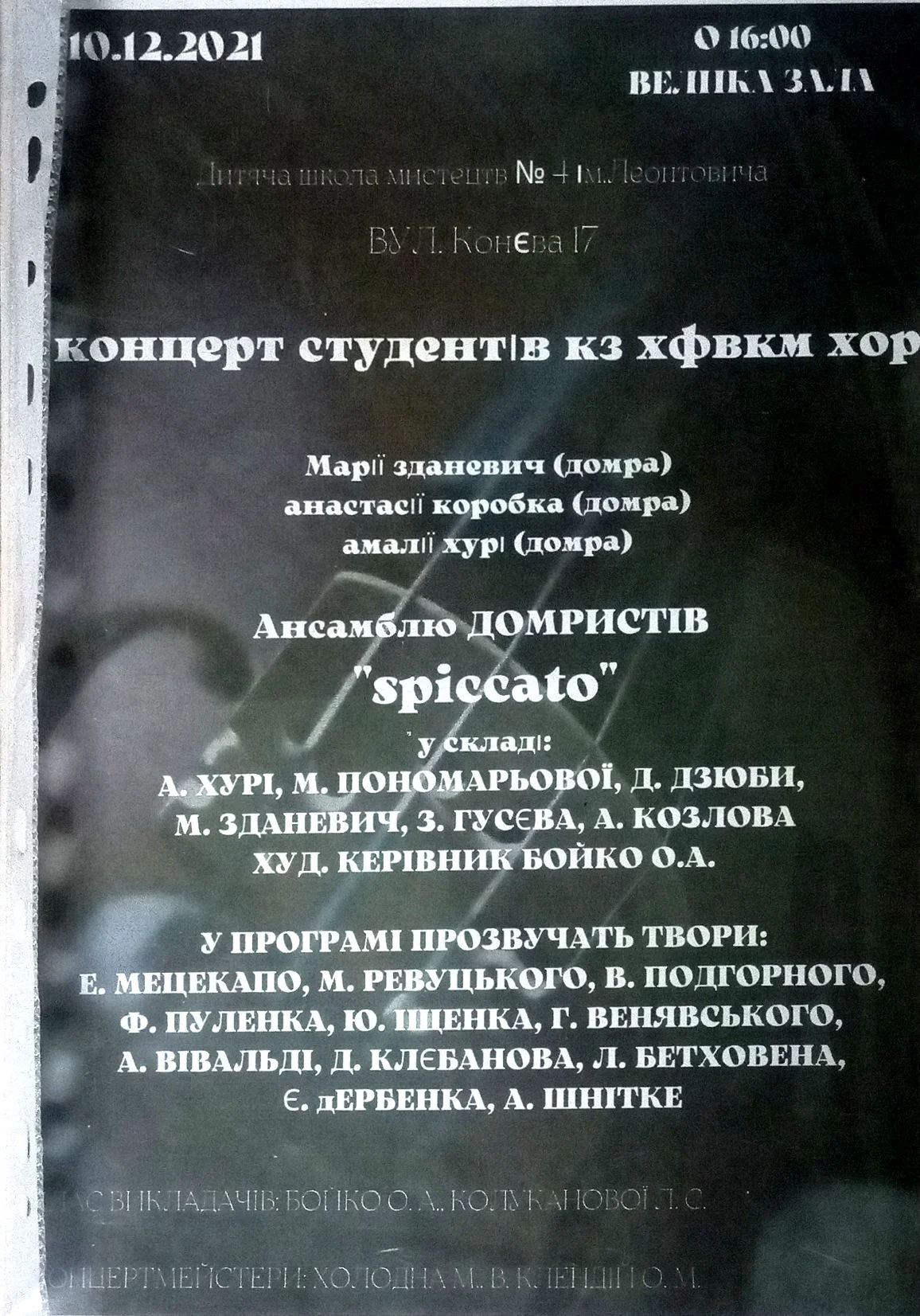Ансамбль домристів «Spiccato» – це яскравий осередок молодих музикантів, об’єднаних любов’ю до музики, спільними ідеями та натхненням. Колектив заснований у 2020 році, а його керівники – викладачі-методисти циклової комісії «Народні інструменти»