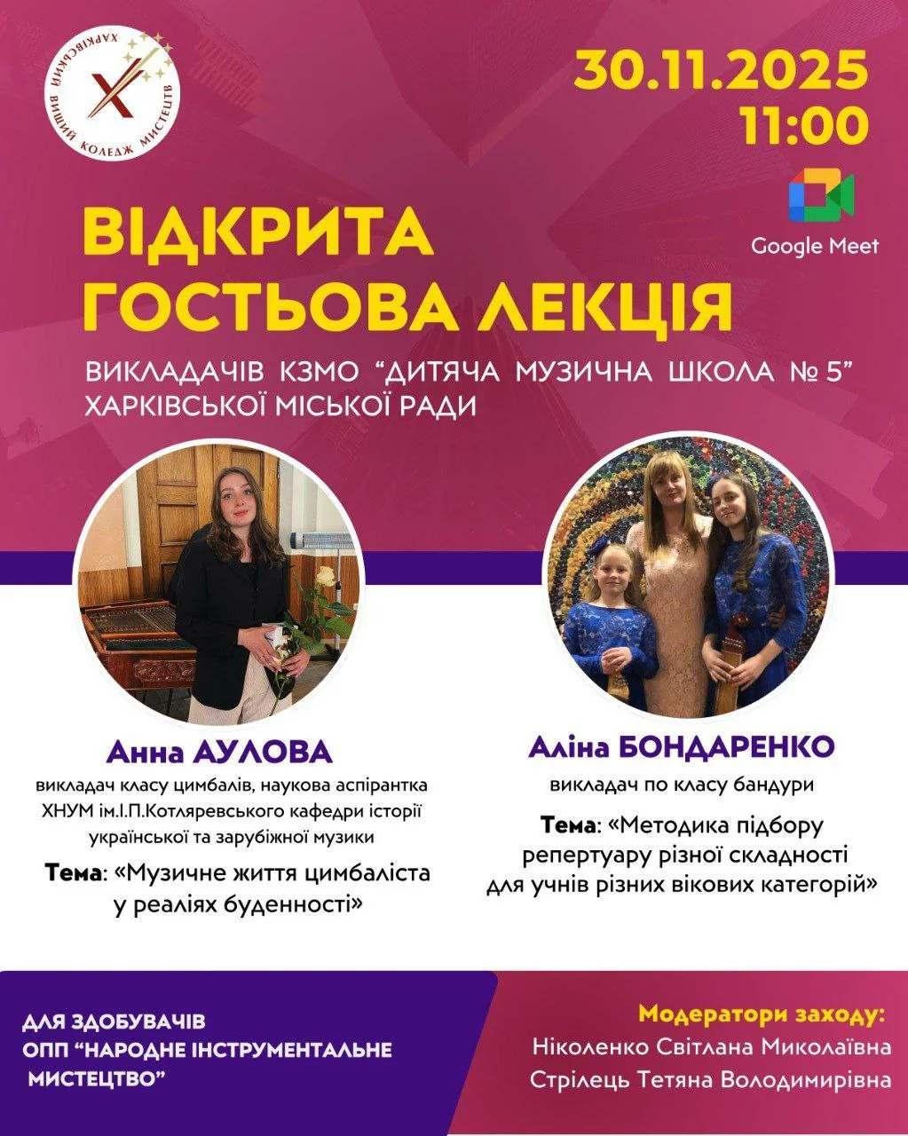 Онлайн-зустрічі здобувачів освіти зі стейкхолдерами/роботодавцями, тема «Підготовка та працевлаштування здобувачів мистецької освіти: компетентності, практика, перспективи», обговорення ОПП «Народне інструментальне мистецтво» спеціальність 025 «Музичне мистецтво», ХФВКМ, 17 грудня 2024 року