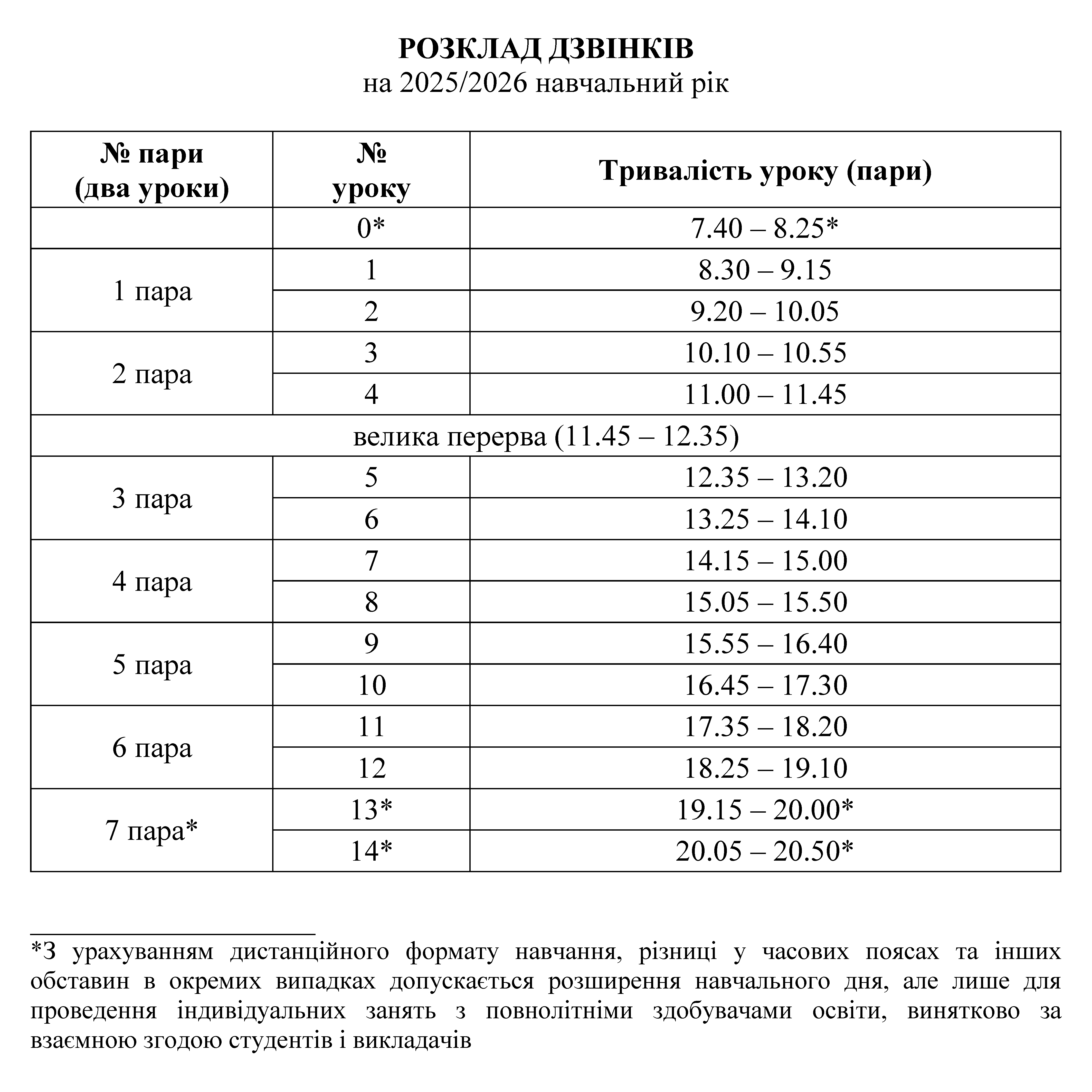Розклад дзвінків на 2025/2026 навчальний рік
