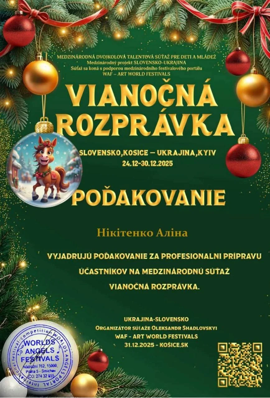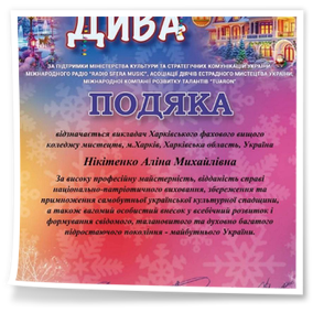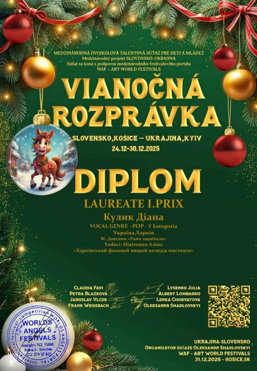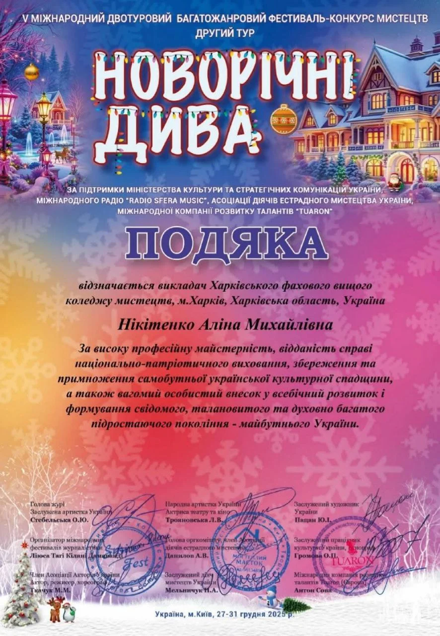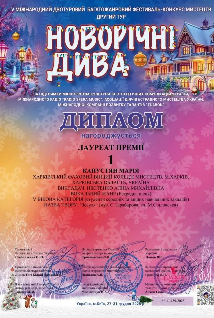 2026 рокуНовий рік почався гарними новинами для здобувачів освіти ОПП «Народне пісенне мистецтво та хорове диригування». Кулик Діана, здобувачка освіти 2 року навчання виборола диплом лауреата 1 ступеня Міжнародного двотурового благодійного конкурсу мистецтв «Різдвяна казка» (Чехія-Україна) у номінації «Естрадний вокал»; Капустян Марія, здобувачка освіти 3 курсу стала лауреатом 1 премії на V Міжнародному двотуровому багато жанровому фестивалі-конкурсі мистецтв «Новорічні дива». Підготувала лауреатів викладач Нікітенко А.М. Вітаємо дівчат та їхнього викладача і бажаємо подальших творчих успіхів!