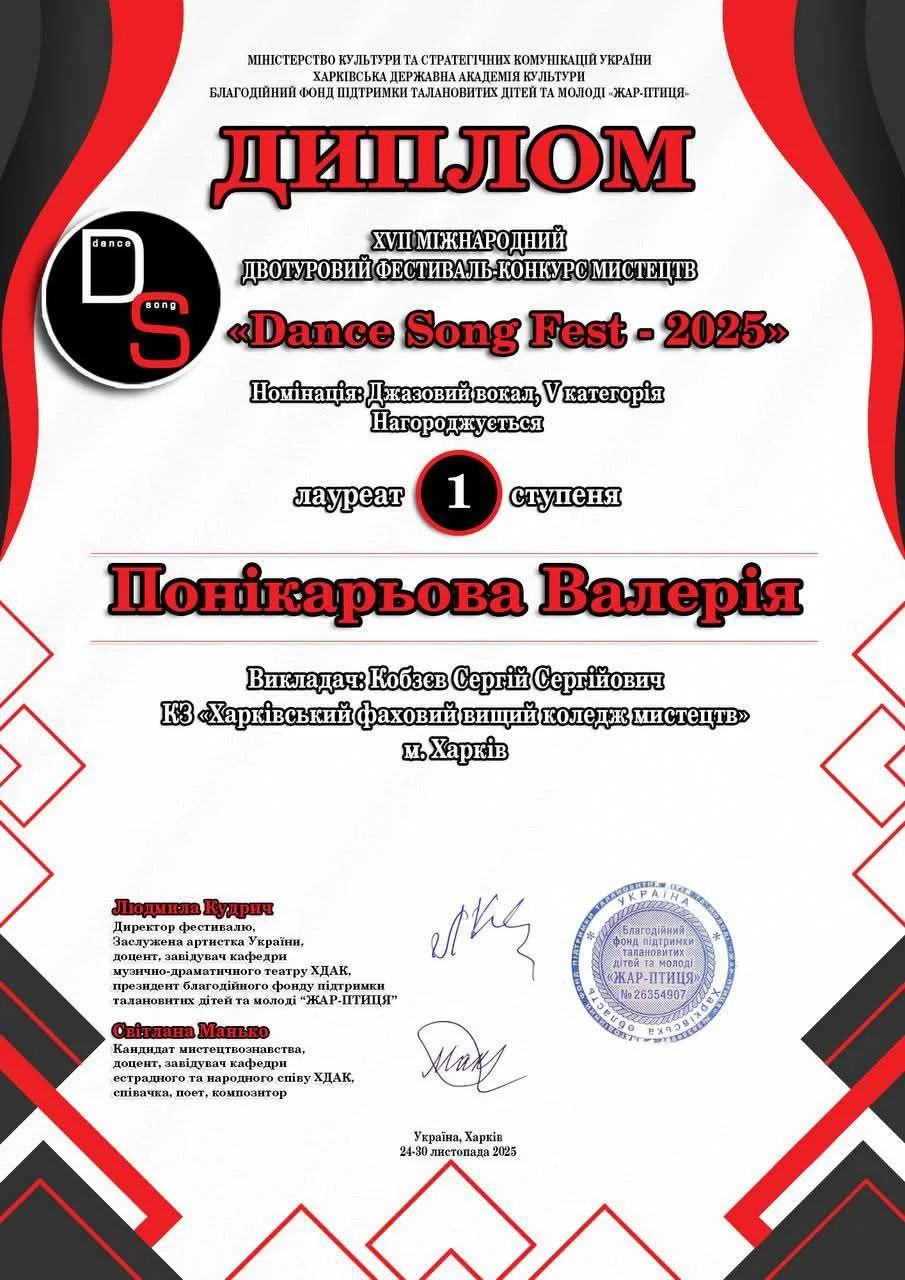 2025 рокуВітаємо Понікарьову Валерію (клас викладача Кобзєва С.С.), студентку 4 курсу з перемогою у XVII Міжнародному двотуровому фестивалі-конкурсі мистецтв «Dance Song Fest – 2025» та бажаємо подальших творчих успіхів.