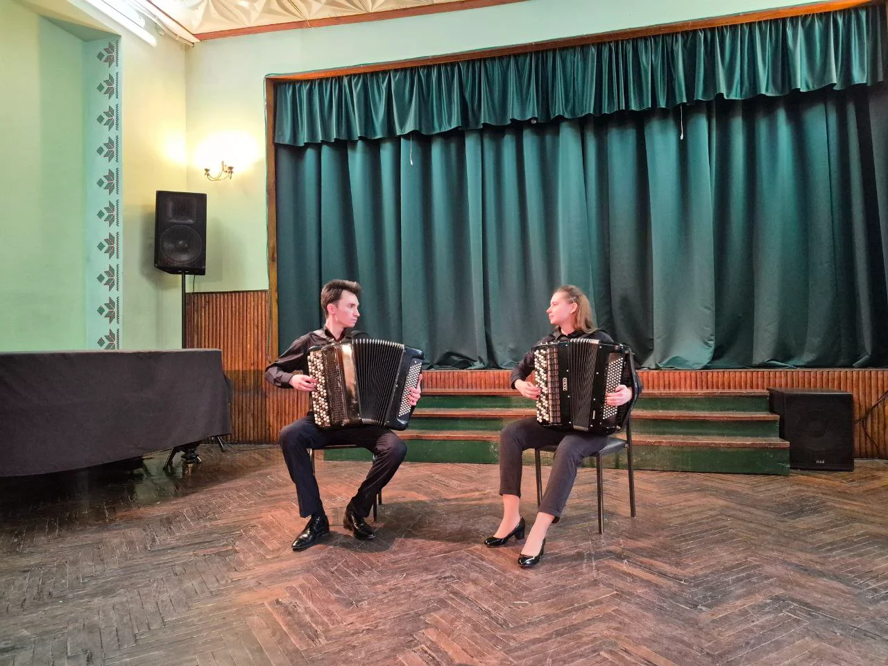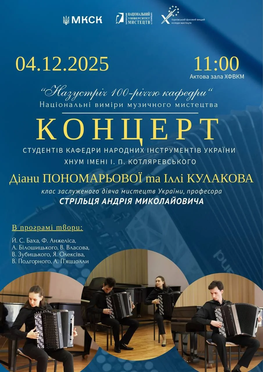 2025 рокуСьогодні затишна зала Харківського фахового вищого коледжу мистецтв наповнилася звуками музики – тут відбувся концерт лауреатів міжнародних та всеукраїнських конкурсів, талановитих студентів-баяністів Харківського національного університету мистецтв імені І.П.Котляревського – Діани ПОНОМАРЬОВОЇ та Іллі КУЛАКОВА, клас заслуженого діяча мистецтв України, професора, завідувача кафедри народних інструментів ХНУМ імені І.П.Котляревського Андрія СТРІЛЬЦЯ.