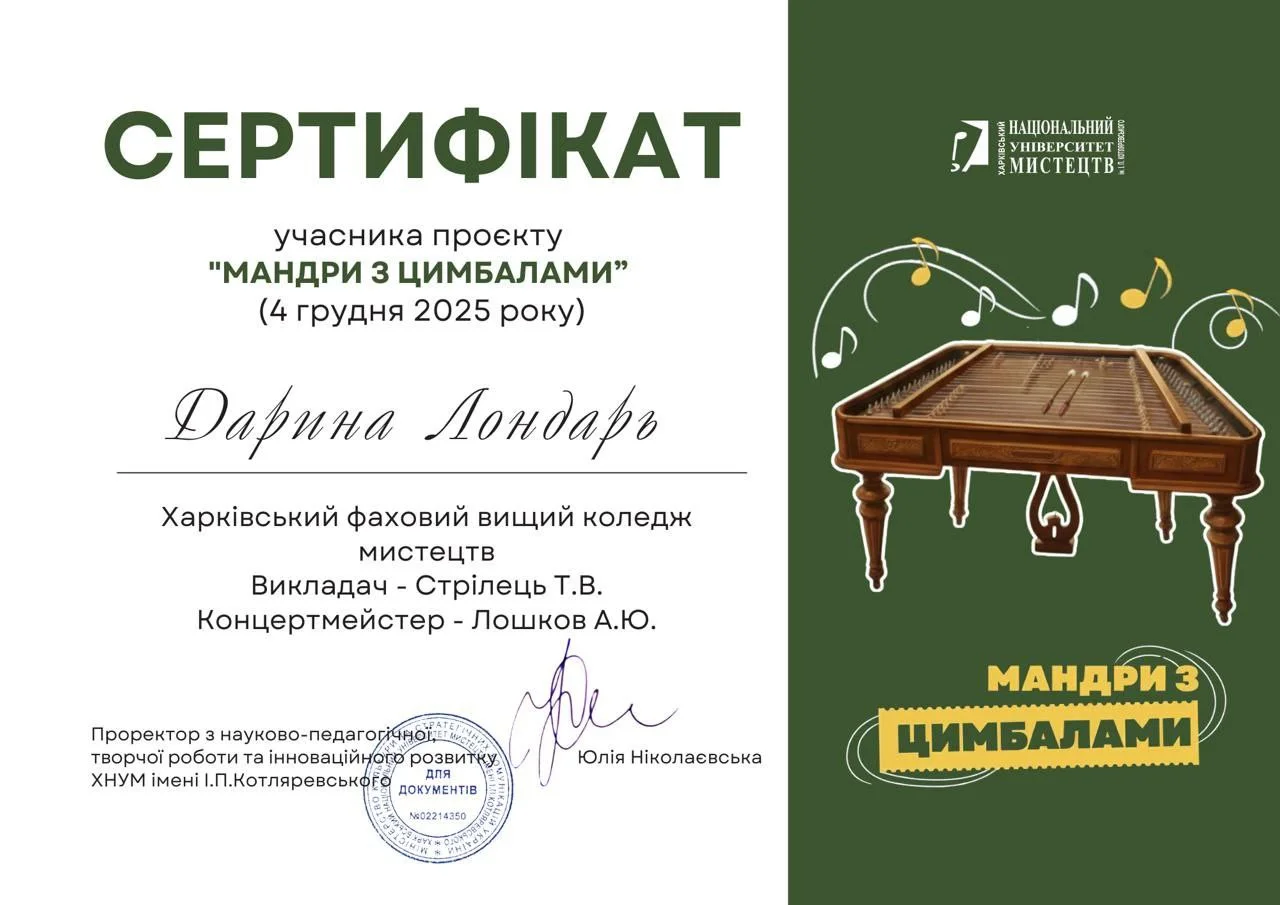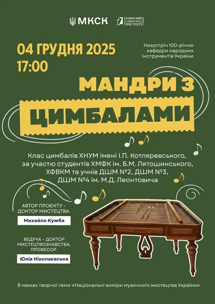 2025 рокуВечір 4 грудня 2025 року зібрав музичну спільноту міста Харкова на концерті цимбальної музики «Мандри з цимбалами», що відбувся у Харківському національному університеті мистецтв імені І.П.Котляревського – автор проєкту доктор мистецтва Михайло Кужба. Концерт подарував присутнім у залі шквал бурхливих емоцій та яскравих вражень від майстерності виконавців. У захоплюючу музичну подорож слухачів повели за собою виконавці мистецьких навчальних закладів міста Харкова та автор творчого проєкту. Створювала теплу атмосферу вечора та супроводжувала мандри цікавими поясненнями – ведуча концерту доктор мистецтвознавства, професор Юлія Ніколаєвська.