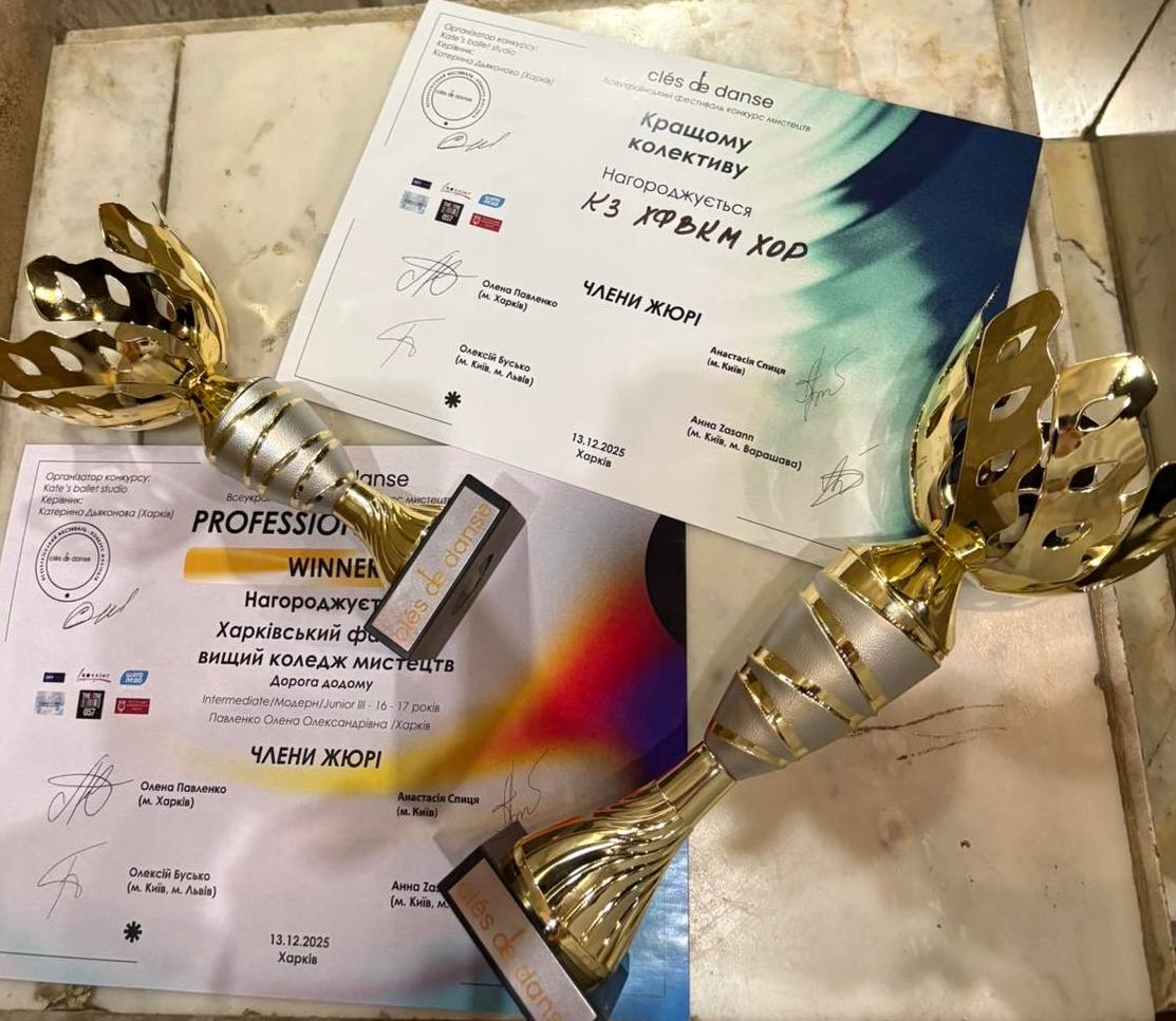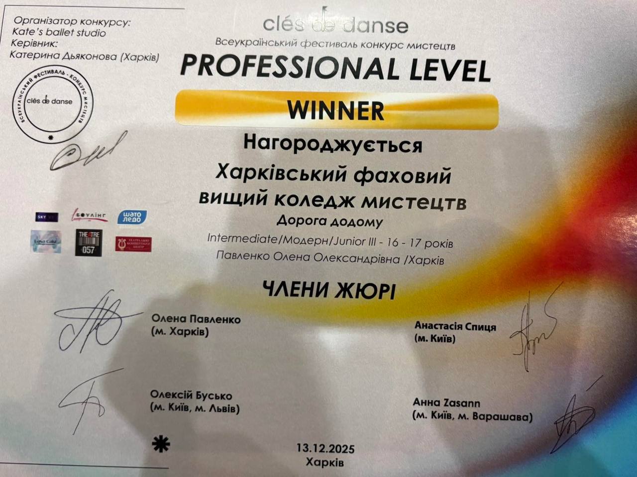 2025 рокуВітаємо наших першокурсників – здобувачів освіти ОПП «Класична та сучасна хореографія» з яскравою прем’єрою номера «Дорога додому» (диплом лауреата 1 ступеня) та Ковальову Ірину, студентку 4 курсу з прем’єрою номера «Конотопська відьма» (диплом лауреата 2 ступеня) на фестивалі-конкурсі хореографічного мистецтва «Cles de danse». Бажаємо здоров’я, успіхів, натхнення та здійснення мрій! Дякуємо Олені Павленко за підготовку студентів-лауреатів та формування у них виконавської майстерності, художнього смаку та сценічної культури.