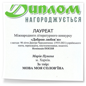 2026 рокуВітаємо Пупену Марію, студентку другого курсу спеціальності «Музичне мистецтво» ОПП «Народне інструментальне мистецтво» з перемогою у Міжнародному літературному конкурсі «Доброю любов’ю», який проводився літературно-мистецьким журналом «Склянка часу» в місті Канів з нагоди 90 ліття Дмитра Чередниченка (1935-2021) українського поета, перекладача, мистецтвознавця, педагога. Марія стала лауреатом у номінації «Поезія» за твір «Мова моя солов’їна». Маріє, зичимо Вам нескінченного джерела ідей та легкого пера. Нехай любов до українського слова стане міцними крилами для нових творчих звершень, а кожен написаний рядок дарує радість, впевненість і віру у власний талант.