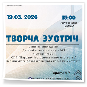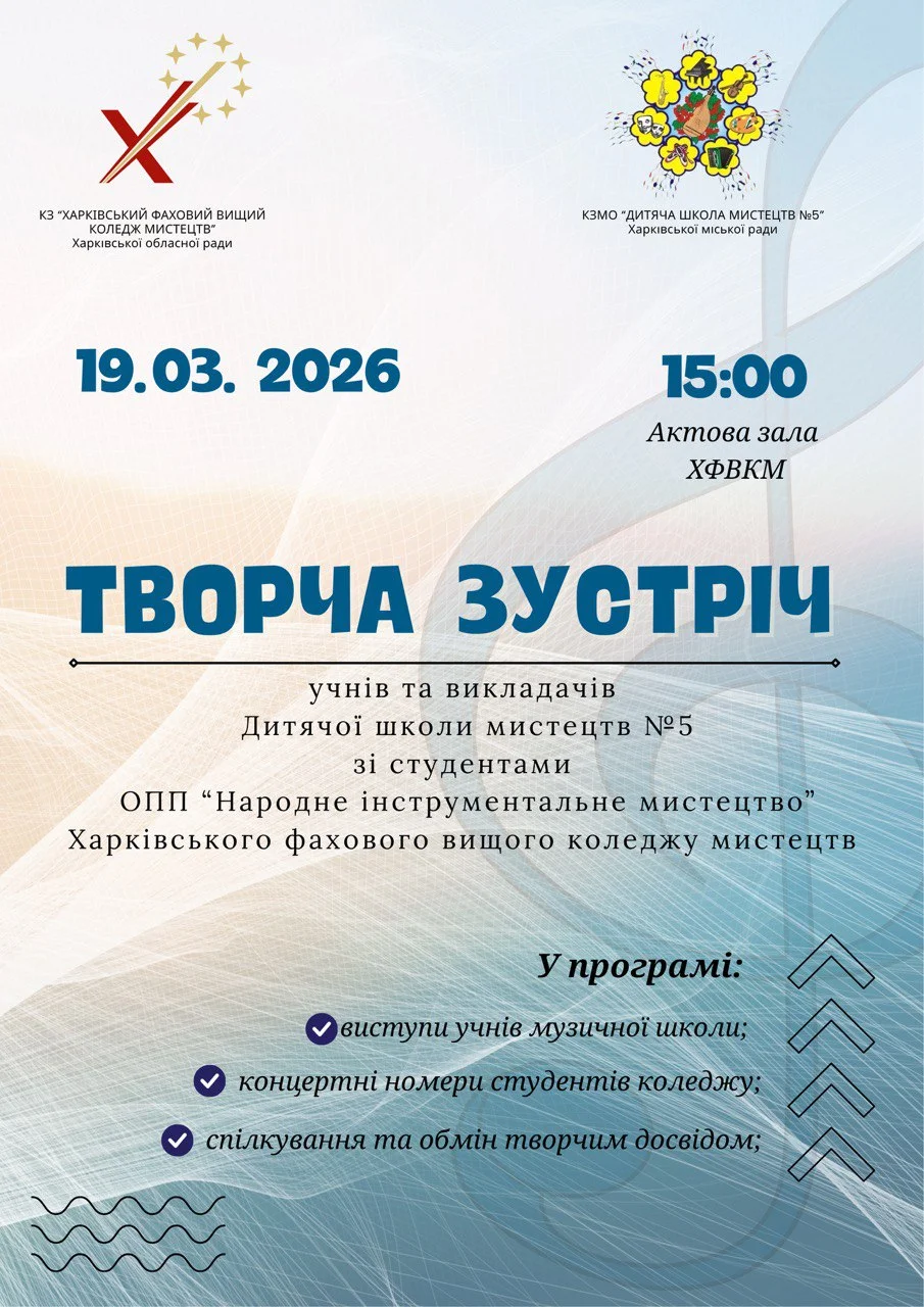 2026 рокуСьогодні глядацька зала Харківського фахового вищого коледжу мистецтв перетворилася на справжній мистецький хаб. Цього дня відбулася творча зустріч здобувачів освіти ОПП «Народне інструментальне мистецтво» з учнями та викладачами Дитячої школи мистецтв №5 міста Харкова.
