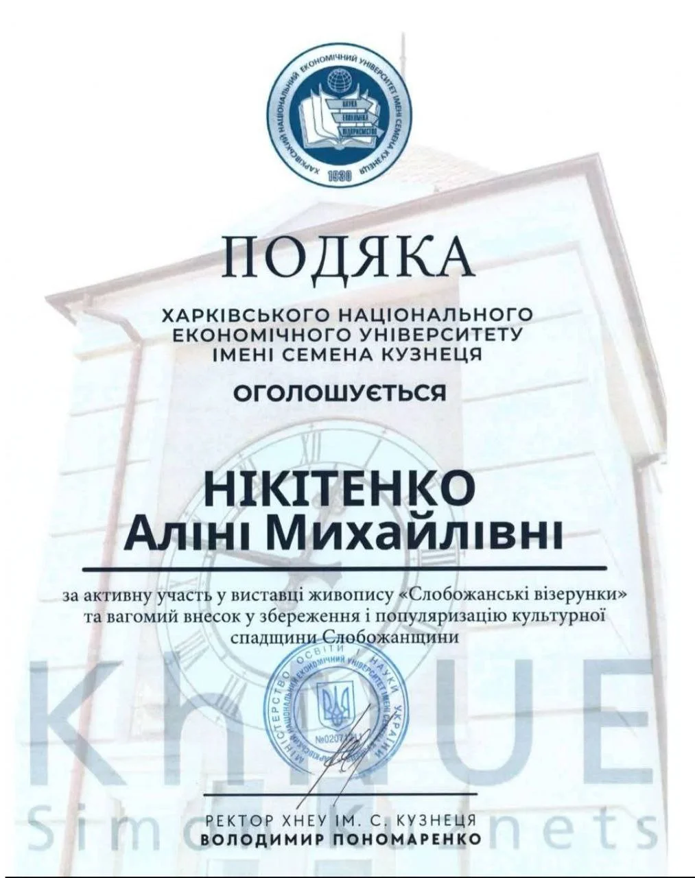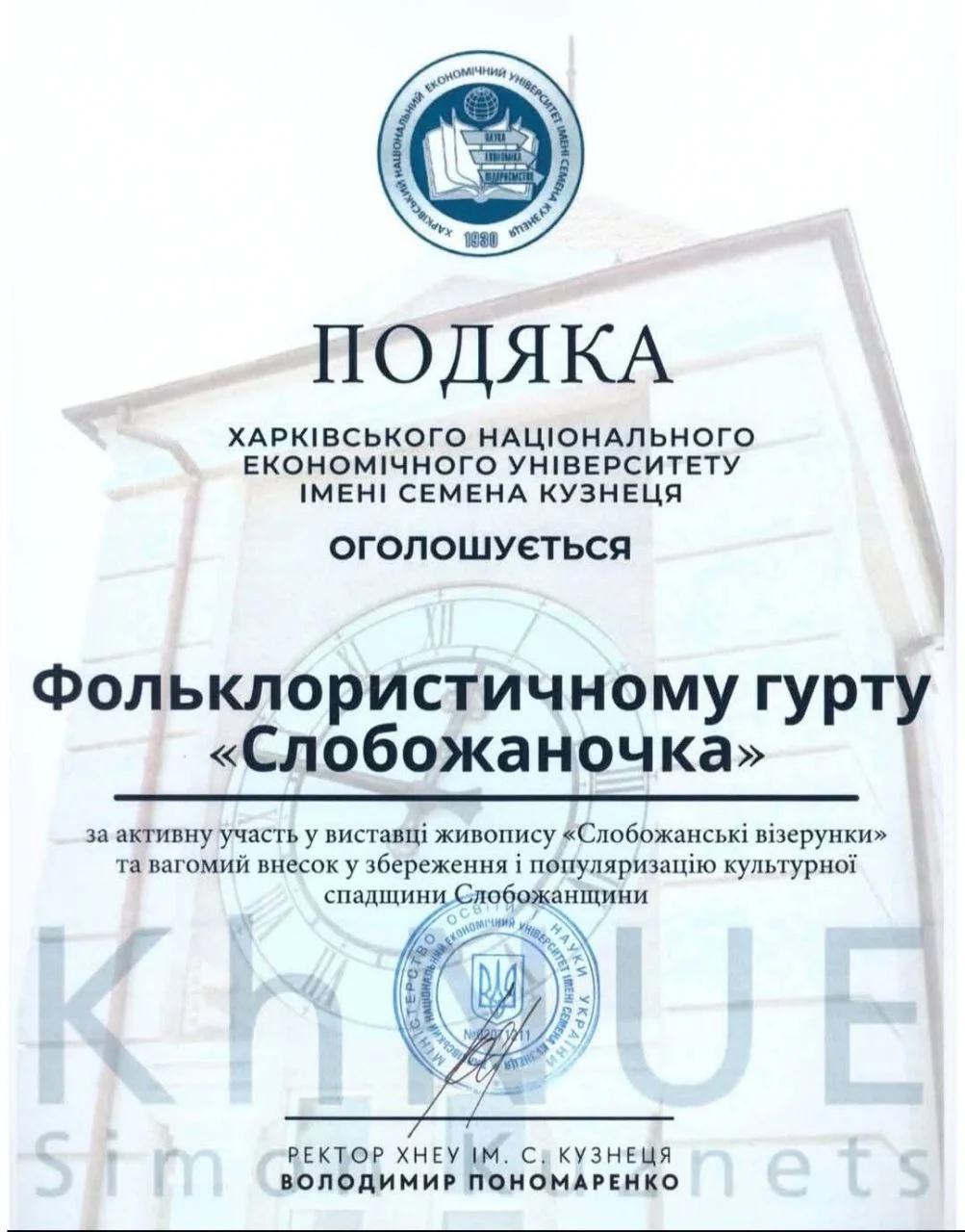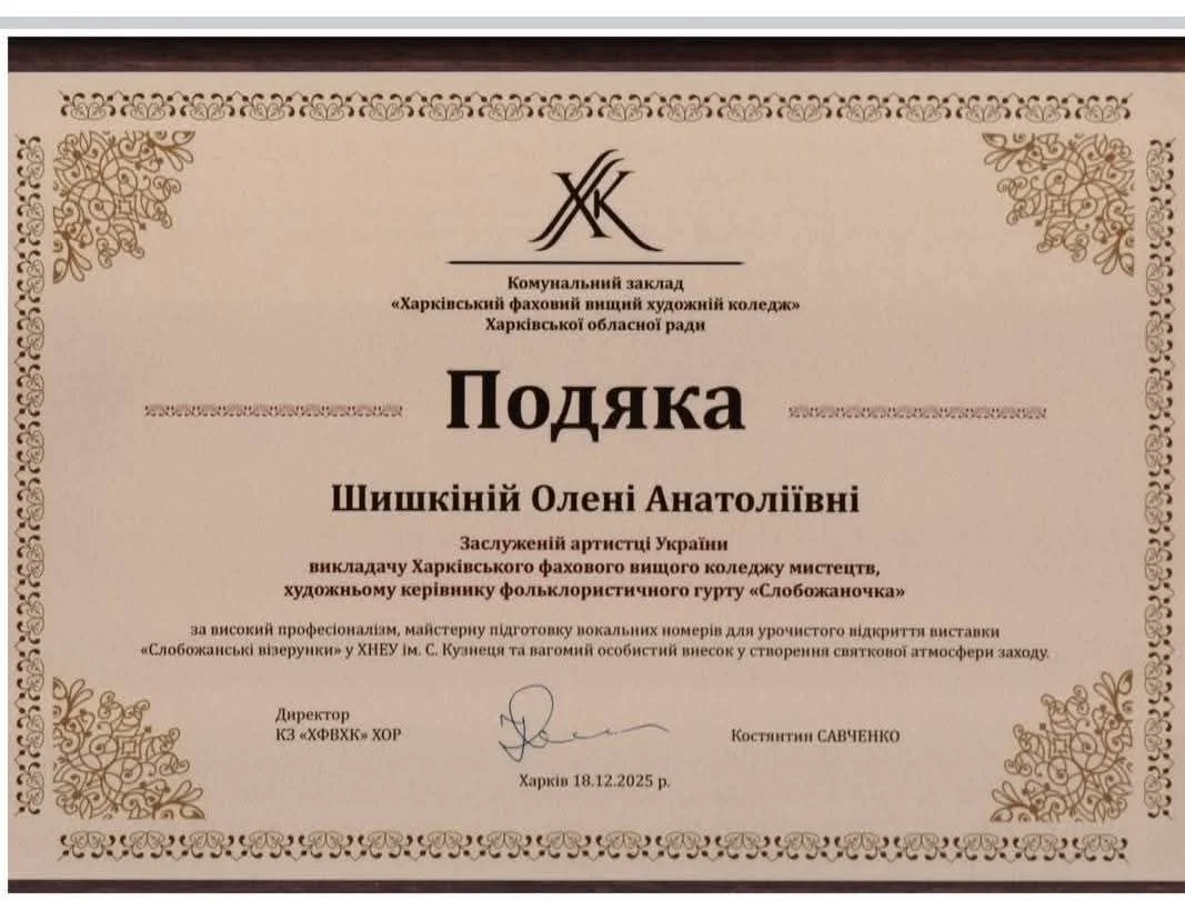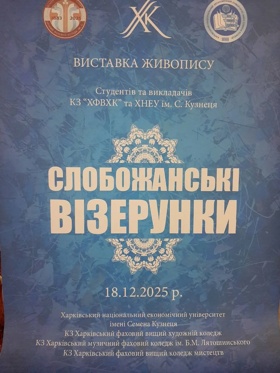 2025 рокуВітаємо талановитих студентів і викладачів ОПП «Народне пісенне мистецтво та хорове диригування» – активних і постійних учасників культурно-мистецьких заходів нашого міста. Фольклористичний гурт «Слобожаночка» (керівник Олена Шишкіна ) та Капустян Марія, студентка 3 курсу (керівник Аліна Нікітенко) були запрошені 18 грудня 2025 року на відкриття виставки живопису «Слобожанські візерунки», яку було організовано Харківським національним економічним університетом імені Семена Кузнеця у співдружності з мистецькими фаховими коледжамим. Харкова. Фольклористичний гурт «Слобожаночка» представив яскраві вокальні номери на відкритті виставки. Різдвяні та новорічні побажання виконавців супроводжувались оплесками глядачів та відзначені подяками від організаторів цього свята за збереження і популяризацію культурної спадщини Слобожанщини.