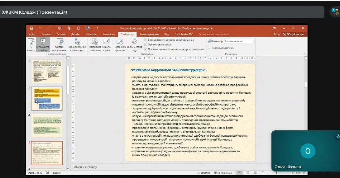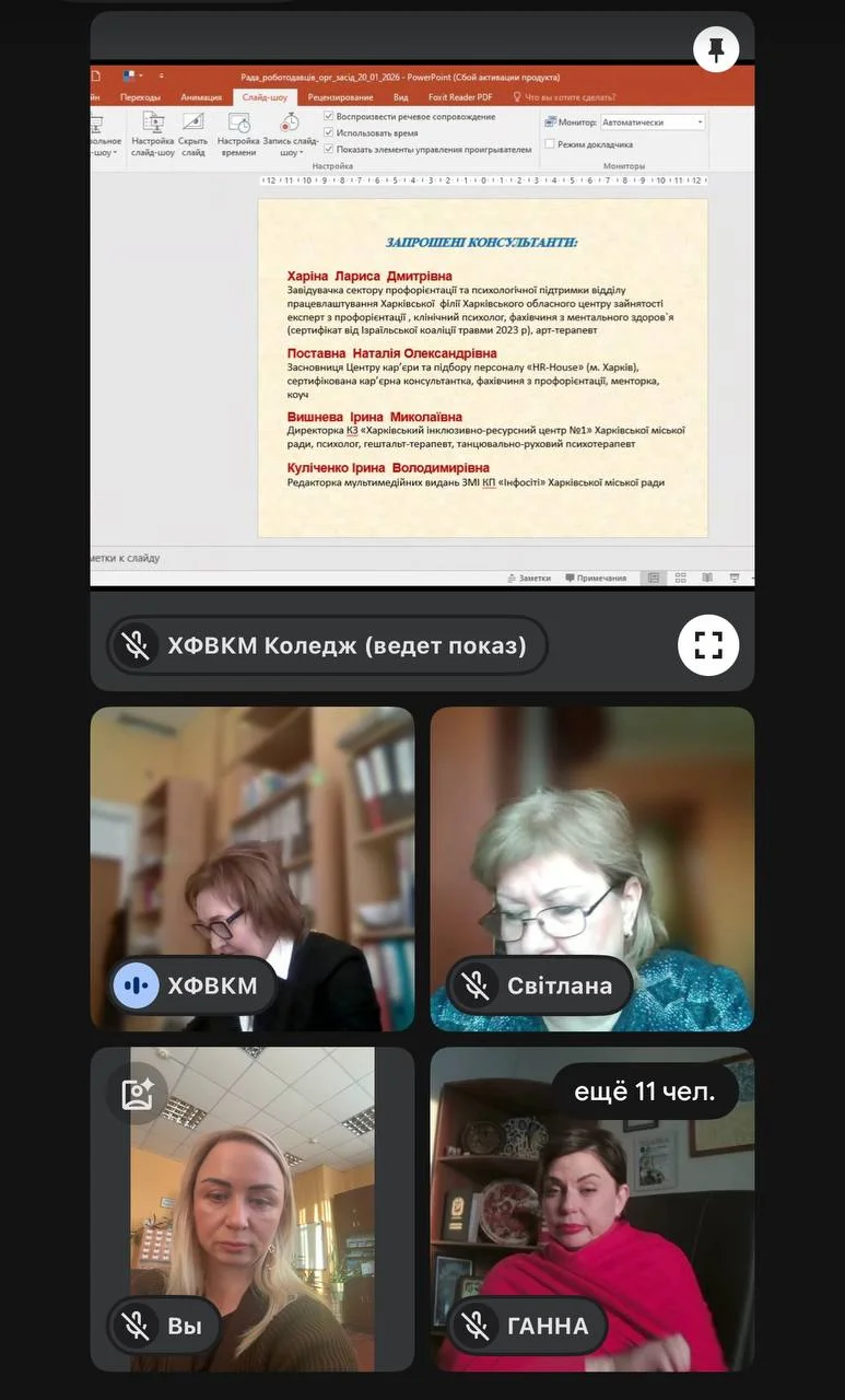 2026 рокуСьогодні відбулося організаційне засідання оновленого складу Ради роботодавців в онлайн-режимі. На засіданні педагогічної ради (листопад 2025 року) було затверджено: структуру Ради роботодавців (за секціями відповідно до ОПП), перелік кандидатур від циклових комісій, порядок денний першого засідання, до якого увійшли питання: про організацію роботи Ради роботодавців Коледжу; затвердження Плану роботи Ради роботодавців на ІІ півріччя 2025/2026 навчального року.