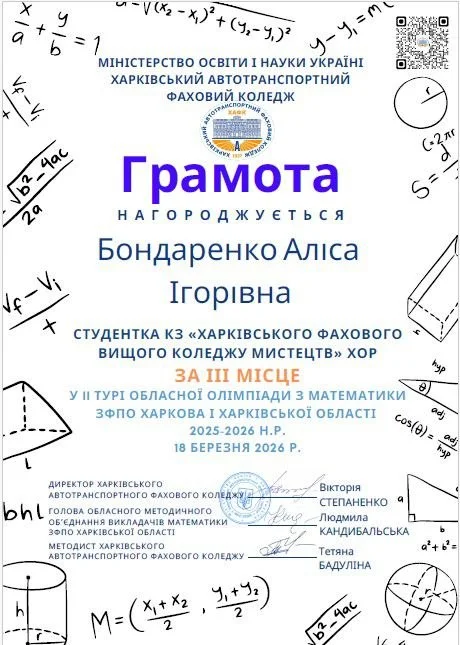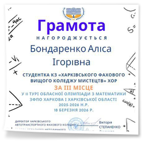 2026 рокуВітаємо Бондаренко Алісу, здобувача освіти ОПП «Класична та сучасна хореографія», яка здобула III місце у II турі обласної олімпіади з математики. Цей успіх результат Вашої наполегливості та любові до точних наук. Бажаємо не зупинятися на досягнутому, підкорювати нові інтелектуальні вершини. Велика вдячність Громовій Н.В. за підготовку переможниці.