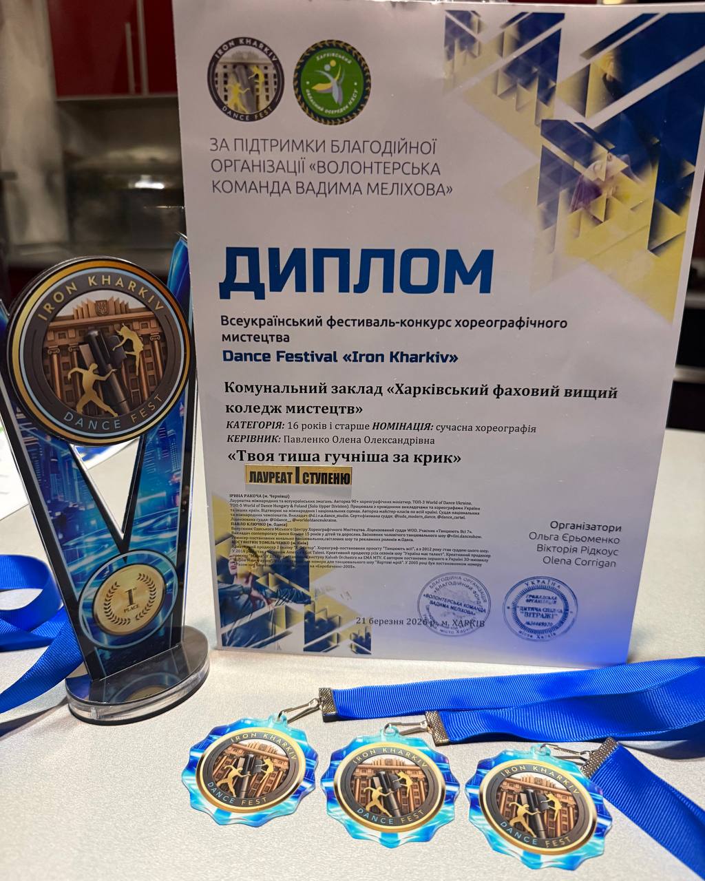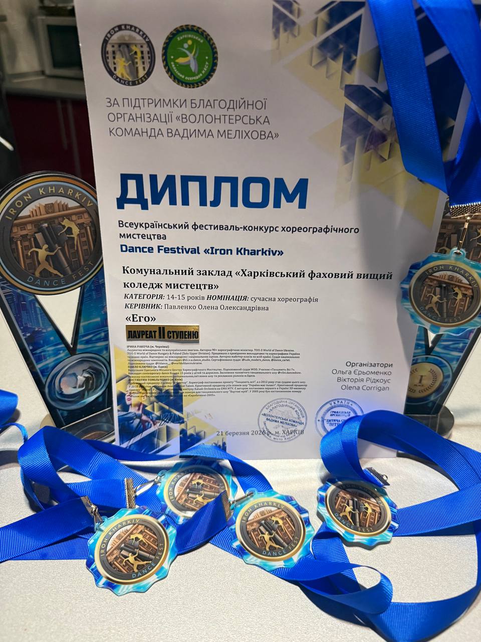 2026 рокуСьогодні здобувачі освіти ОПП «Класична та сучасна хореографія» взяли участь у фіналі конкурсу «Iron Kharkiv» з 4 номерами, 3 із них – прем’єри: «Чужа шкіра» виконавці здобувачі освіти 2 курсу стали лауреатами 1 ступеня; «Твоя тиша гучніша за крик» виконавці здобувачі освіти 1 та 2 курсів стали лауреатами 1 ступеня; «Его» виконавці здобувачі освіти 1 курсу стали лауреатами 2 ступеня; «Пульс волі» виконавці здобувачі освіти 2 курсу отримали звання лауреатів 1 ступеня. Вітаємо студентів та викладачів з успішною участю у творчому випробуванні. Бажаємо нашим талановитим студентам наснаги та перемог у майбутньому.