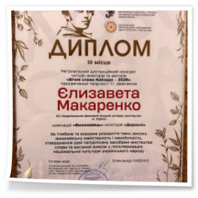 2026 рокуВітаємо здобувачів освіти ОПП «Видовищно-театралізовані заходи»! Студентки ІІІ курсу спеціалізації «Сценічне мистецтво» – Єлизавета Макаренко та Ніка Проніна – яскраво й натхненно представили свій навчальний заклад на регіональному конкурсі читців «Вічне слово Кобзаря – 2026». Їхні виступи вирізнялися дієвим словом, щирістю емоцій та високою культурою сценічного слова. Завдяки наполегливості, таланту та творчому підходу викладача Юлії Олійник, дівчата гідно вибороли почесне ІІІ місце. Це досягнення є свідченням їхньої майстерності, любові до українського слова та прагнення до професійного зростання. Щиро вітаємо та бажаємо нових творчих звершень і перемог!