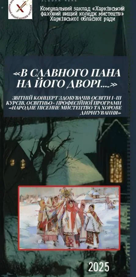 2025 рокуРіздвяно-святковим і водночас теплим та родинним був сьогоднішній звітний концерт здобувачів освіти освітньо-професійної програми «Народне пісенне мистецтво та хорове диригування». Підсумовуючи творчі здобутки навчального семестру, глядачам була представлена насичена вокально-хорова палітра: сольні та ансамблеві номери у виконанні студентів 1-3 курсів (концертмейстери – Володимир Карпенко, Аліна Нікітенко); хорові твори у виконанні хору «Основа» (керівники Сергій Кобзєв, Олена Василевська, Олена Кобзєва); календарно-обрядові пісні та різдвяні колядки фольклористичного гурту «Слобожаночка» (керівник Олена Шишкіна).