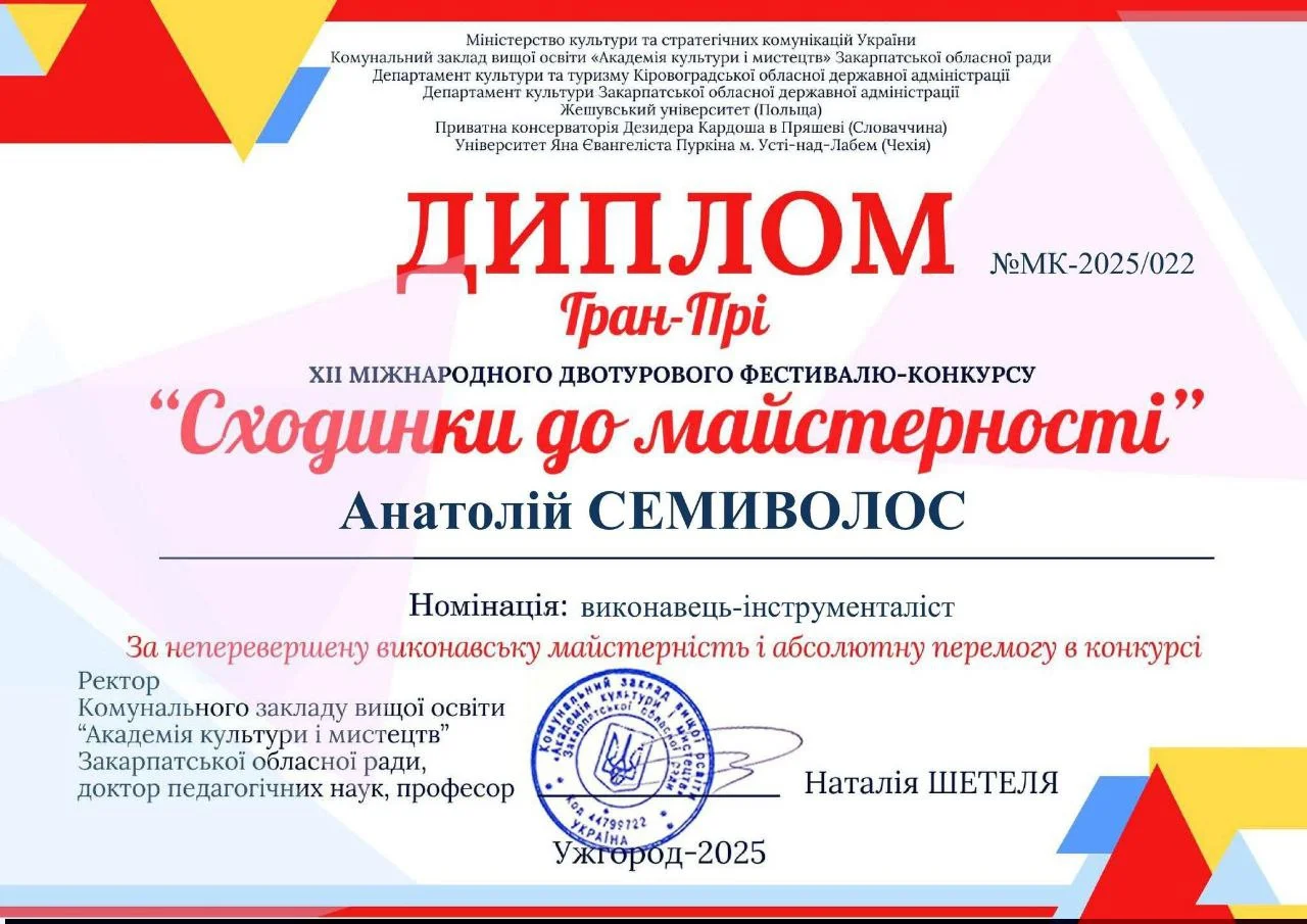 2025 рокуЩиро вітаємо Семиволоса Анатолія здобувача освіти ОПП «Народне інструментальне мистецтво» (клас викладача Ірини Половинки) з блискучою перемогою у XII Міжнародному фестивалі-конкурсі «Сходинки до майстерності» (місто Ужгород) та здобуттям найвищої нагороди – Гран-прі!
