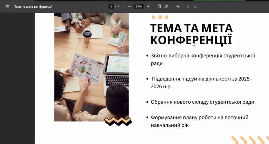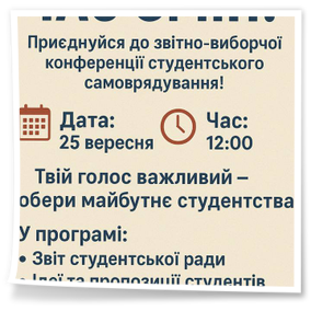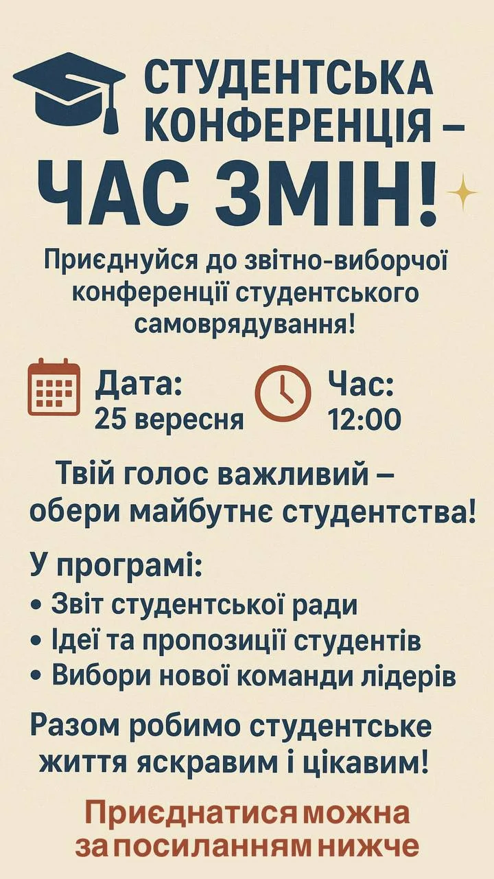 2025 рокуУ Коледжі відбулася звітно-виборча конференція студентського самоврядування. З вітальним словом від адміністрації виступили Ірина Скирда та Ірина Цибина. Плідної роботи учасникам побажали: Голова профкому Юлія Олійник, Голова методичного об’єднання керівників навчальних груп Олена Кобзєва.