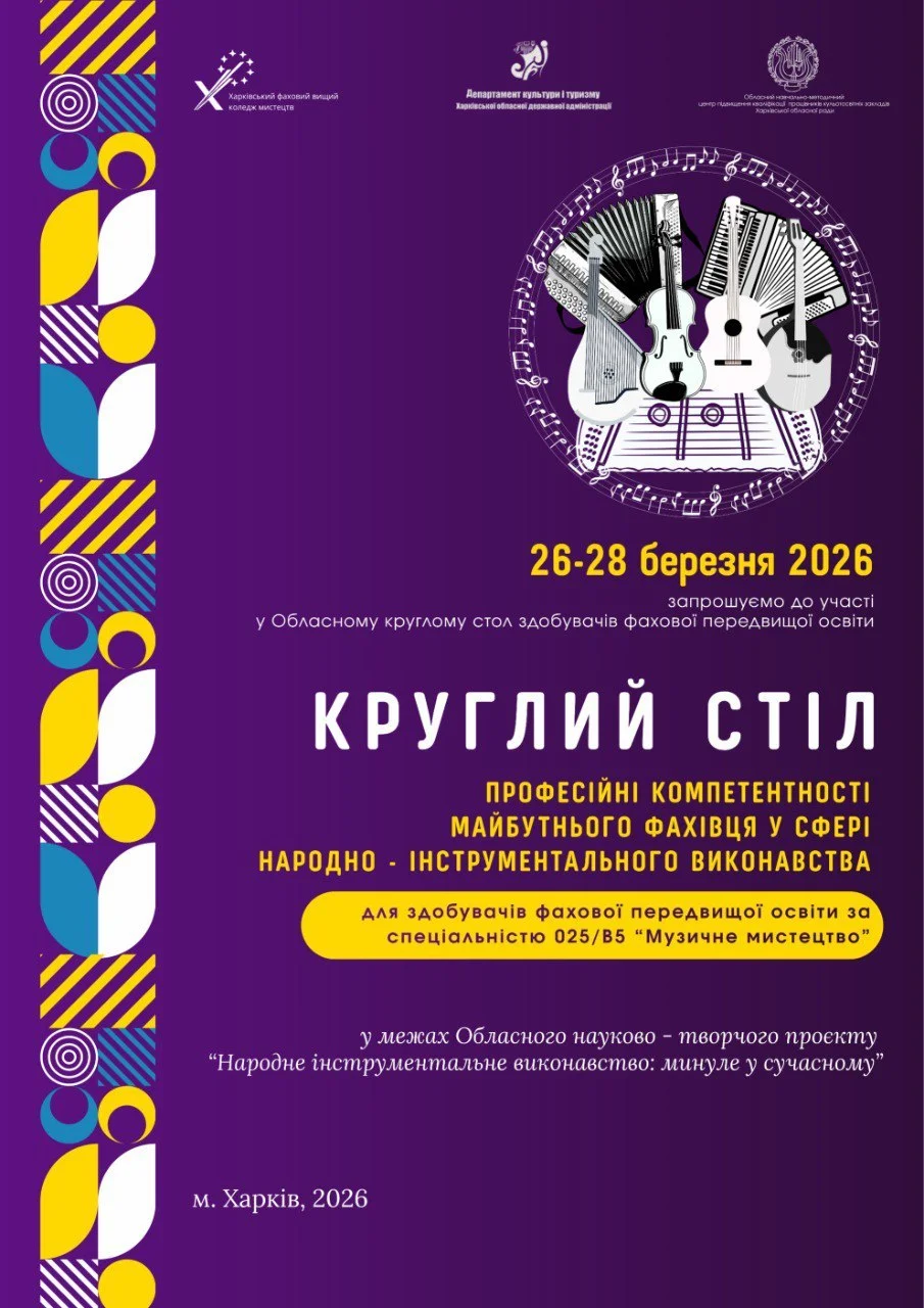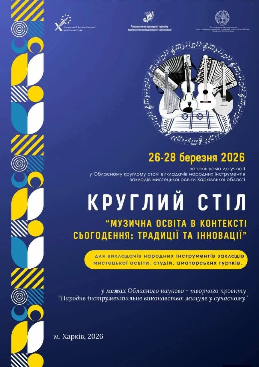 2026 рокуЗ 26 по 28 березня 2026 року у місті Харкові відбувся Обласний науково-творчий проєкт «НАРОДНЕ ІНСТРУМЕНТАЛЬНЕ ВИКОНАВСТВО: МИНУЛЕ У СУЧАСНОМУ». Захід був організований і проведений цикловою комісією «Народні та естрадні інструменти» Харківського фахового вищого коледжу мистецтв за сприяння Департаменту культури і туризму Харківської державної військової адміністрації та у співпраці з Обласним навчально-методичним центром підвищення кваліфікації працівників культосвітніх закладів Харківської обласної ради.