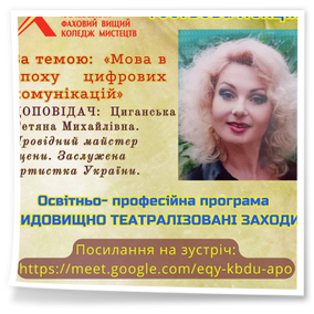 Сьогодні у Харківському фаховому вищому коледжі мистецтв відбулася змістовна та надзвичайно цікава зустріч студентів із митцями, а саме з провідним майстром сцени заслуженою артисткою України Тетяною Циганською на тему «Мова в епоху цифрових комунікацій». Захід пройшов у теплій творчій атмосфері, де поєдналися наука, мистецтво та сучасні технології.