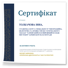 14 березня 2024 року з нагоди 210-річчя від дня народження Тараса Шевченка, в межах заходів освітньо-виховної й культурно-мистецької діяльності Коледжу та проведення навчальної практики, студенти І-ІІ курсів спеціальності 029 «Інформаційна, бібліотечна та архівна справа» взяли участь у IX Всеукраїнському інтелектуальному студентському онлайн турнірі «ВСЕСВІТ ШЕВЧЕНКА: українська ідентичність у часі та просторі».