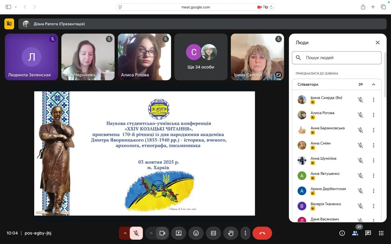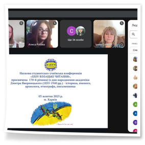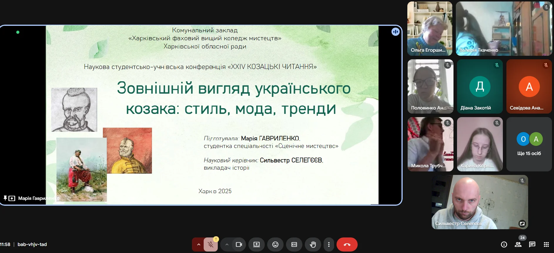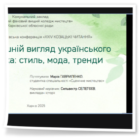 2025 року3 жовтня 2025 року студенти Харківського фахового вищого коледжу мистецтв взяли активну участь у ХХIV науковій студентсько-учнівській конференції «Козацькі читання», присвяченій 170-й річниці від дня народження академіка Дмитра Яворницького. Захід відбувся в онлайн-форматі за ініціативи Харківського національного педагогічного університету імені Г.С. Сковороди.