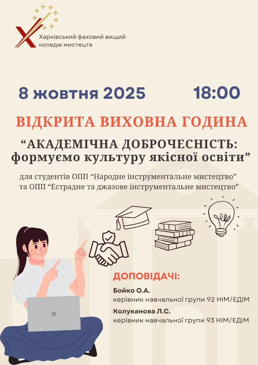 2025 року8 жовтня 2025 року відбулася відкрита виховна година для студентів освітньо-професійних програм «Народне інструментальне мистецтво» та «Естрадне та джазове інструментальне мистецтво» на тему: «Академічна доброчесність: формуємо культуру якісної освіти». Під час зустрічі керівник груп 2 курсу Бойко О.А. та керівник групи 3 курсу Колуканова Л.С. ознайомили студентів із основними принципами академічної доброчесності, наголосили на важливості чесності, відповідальності та поваги в освітньому процесі. У ході обговорення учасники розглянули практичні приклади дотримання етичних норм у навчальній діяльності та творчих проєктах, обмінялися думками щодо шляхів формування культури якісної освіти в сучасному мистецькому середовищі. Такі заходи сприяють підвищенню свідомості студентів, формуванню активної громадянської позиції та розвитку професійної відповідальності майбутніх митців.