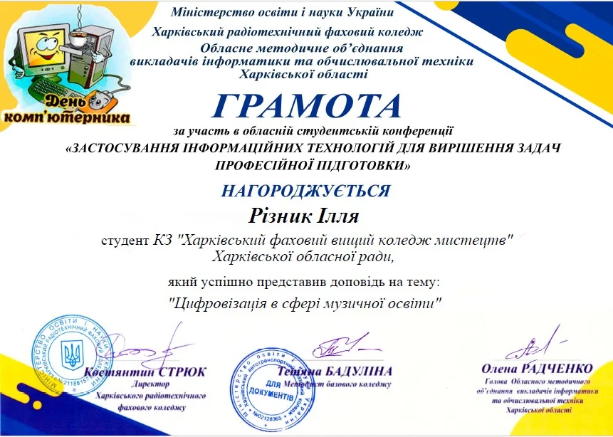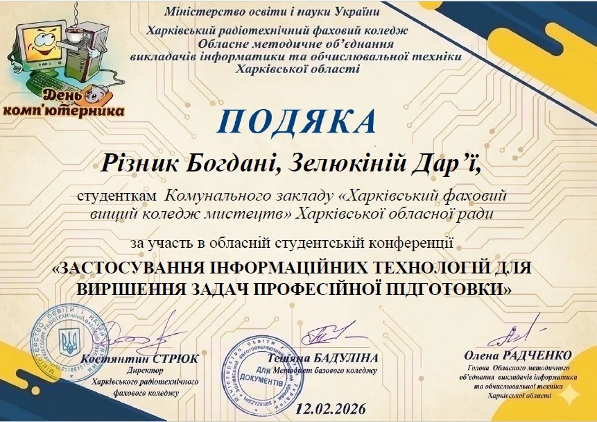 2026 рокуВітаємо студентів коледжу з отриманням Грамот та Подяк за виступ із доповідями та написання тезів у збірник конференції до Дня комп’ютерника «Застосування інформаційних технологій для вирішення задач професійної підготовки»: Бабенко Аріну, Зелюкіну Дар’ю, Каюмову Софію, Кулик Діану, Пупену Марію, Різник Богдану, Різник Іллю, Узун Мирославу, Шендрик Богдана. Викладачі Громова Н.В., Добролюбова Н.В., Нікітенко А.В. та Правдівцева Л.В. отримали Подяки за підготовку студентів до конференції. Особливо відмітили виступ Бабенко Аріни, яка під керівництвом Громової Наталії Валеріївни представила роботу «Топ 25 історичних дат, які має знати кожен українець» – інтерактивну презентацію із гіперпосиланнями.
