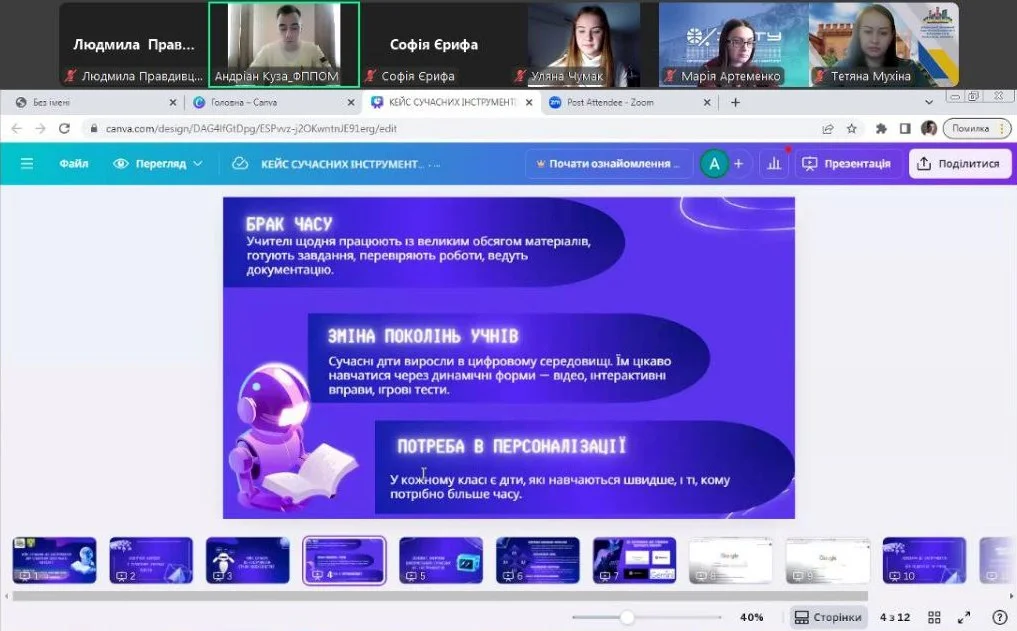 2025 рокуУ четвер, 30 жовтня, для здобувачів освіти освітньо-професійної програми «Народне інструментальне мистецтво» відбулася гостьова лекція, на яку були запрошені викладачі відділу народних інструментів Комунального закладу мистецької освіти «Дитяча музична школа №5» Харківської міської ради – Аліна Володимирівна Бондаренко (клас бандури) та Анна Святославівна Аулова (клас цимбалів). Спікери представили цікаві й інформативні доповіді на професійні теми. Викладач Аліна Бондаренко провела лекцію на тему «Методика підбору репертуару різної складності для учнів різних вікових категорій», а Анна Аулова поділилася своїм педагогічним досвідом у виступі «Музичне життя цимбаліста у реаліях буденності».