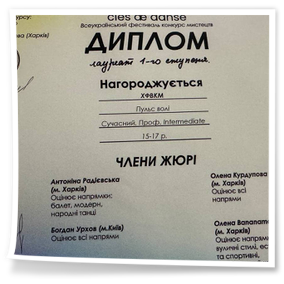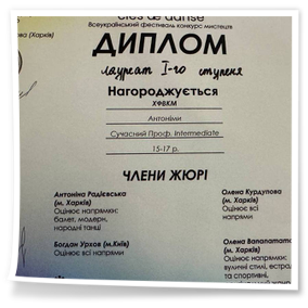 2025 рокуВітаємо Шевченко Анастасію, Іванову Аріну, Буряк Ксенію – здобувачів освіти ОПП «Класична та сучасна хореографія» з перемогою у конкурсі хореографічного мистецтва «Cles de danse», який відбувся у місті Харкові 18 жовтня цього року. Дівчата вибороли дипломи лауреатів І ступеня за виконання яскравих хореографічних номерів: варіація «Вакханки» з балету «Вальпургієва ніч», варіація «Скрипки» з балету «Пахіта», варіація «Діани» з балету «Діана і Актеон». Щира вдячність викладачам – заслуженій артистці України Валентині Марковій, Олені Шлягіній за підготовку лауреатів та організаторам фестивалю, суддівській колегії – Антоніні Радієвській, Богдану Урхову, Олені Курдуповій. Ваша творчість – це світло, яке надихає! Дякуємо за емоції, за талант і відданість мистецтву.