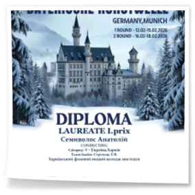 2026 рокуВітаємо Семиволоса Анатолія з перемогою у Міжнародному двотуровому багатожанровому фестивалі-конкурсі «Баварська мистецька хвиля», який проходив з 12 по 18 лютого 2026 року в місті Мюнхені Німеччини. Анатолій здобув звання лауреата 1 премії в номінації «Оркестрове диригування». Бажаємо переможцю та його викладачу Стрілець Т.В. нових творчих звершень. Нехай музика назавжди залишається мовою миру, світла та добра!