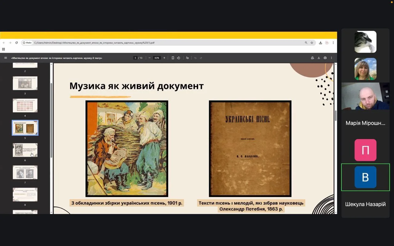 2026 рокуСьогодні у коледжі відбувся позакласний захід «Мистецтво як документ епохи: як історики читають картини, музику й театр». Організатором виступив студент історичного факультету Харківського національного університету імені В.Н.Каразіна Віталій Меркулов, який проходить педагогічну практику на базі нашого закладу освіти (керівники – викладачі історії Скирда І.М., Селегєєв С.С.).