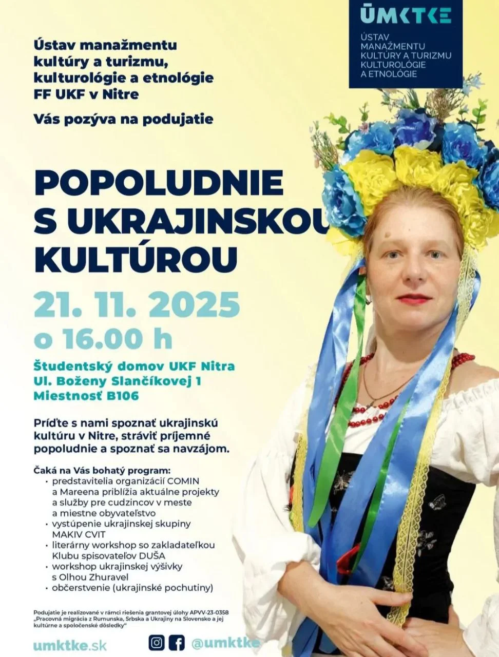 2025 рокуСьогодні Україна була представлена на престижному мистецько-освітньому заході «Afternoon with Ukrainian culture» (укр. «Полудень з українською культурою»), організованому Інститутом менеджменту культури і туризму, культурології та етнології факультету філософії Університету Костянтина Філософа у місті Нітра (Словаччина). Подію проведено у рамках грантового проєкту «Трудова міграція з Румунії, Сербії та України до Словаччини та її культурні та соціальні наслідки».