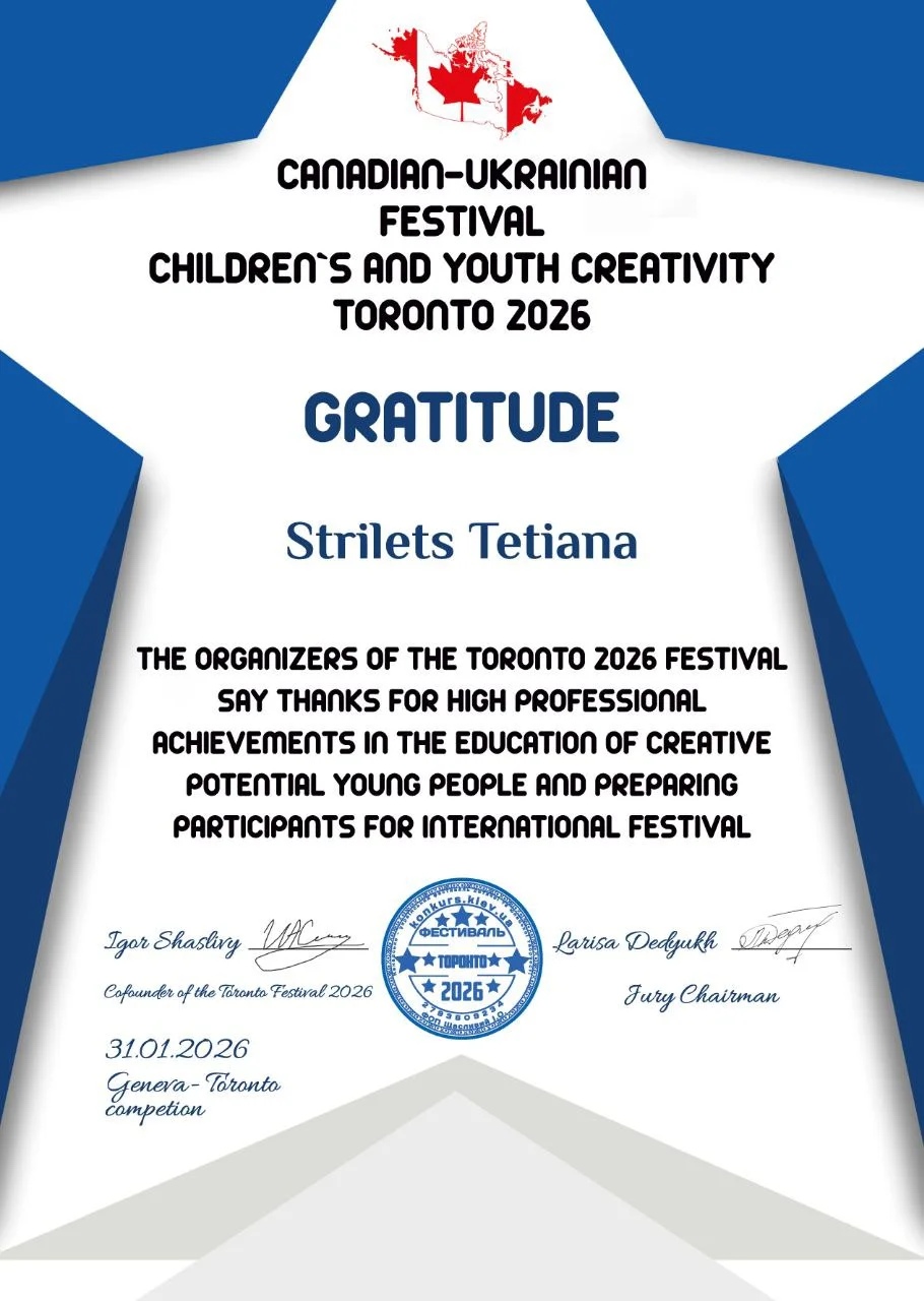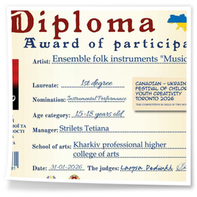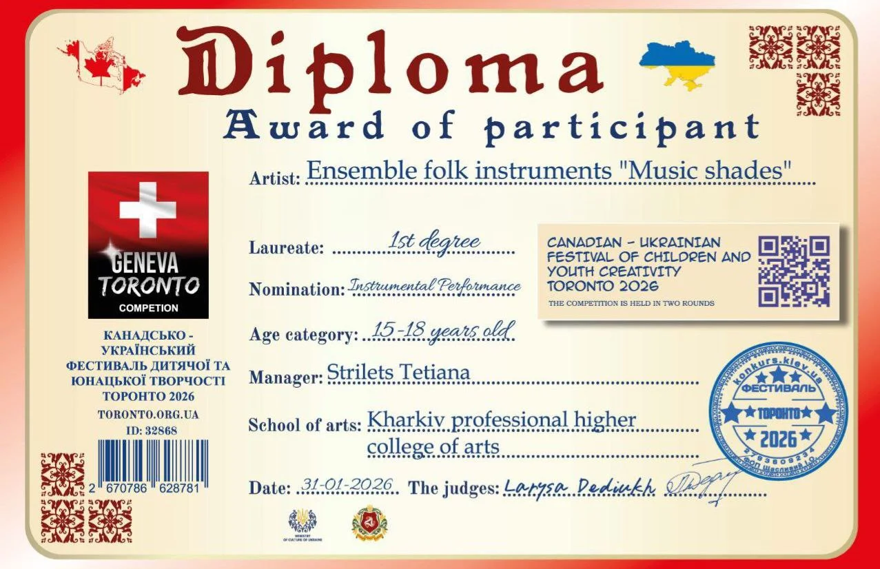 2026 рокуВітаємо учасників творчого колективу коледжу «Музичні барви» та його керівника Стрілець Т.В. з яскравою перемогою у Канадсько-українському двотуровому фестивалі дитячої та юнацької творчості Торонто 2026, «Женева-Торонто». Колектив здобув Диплом Лауреата І ступеня. Бажаємо нашим талановитим студентам нових творчих звершень та перемог!