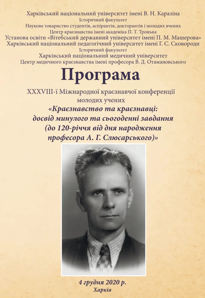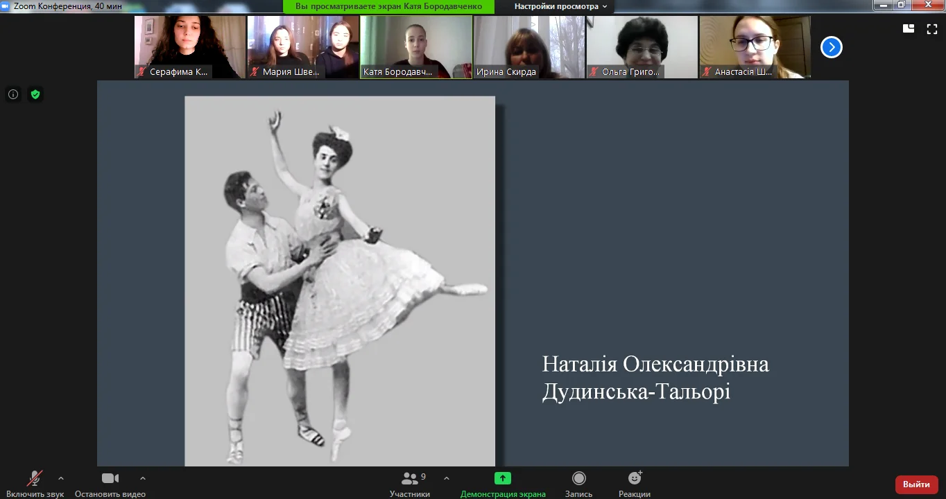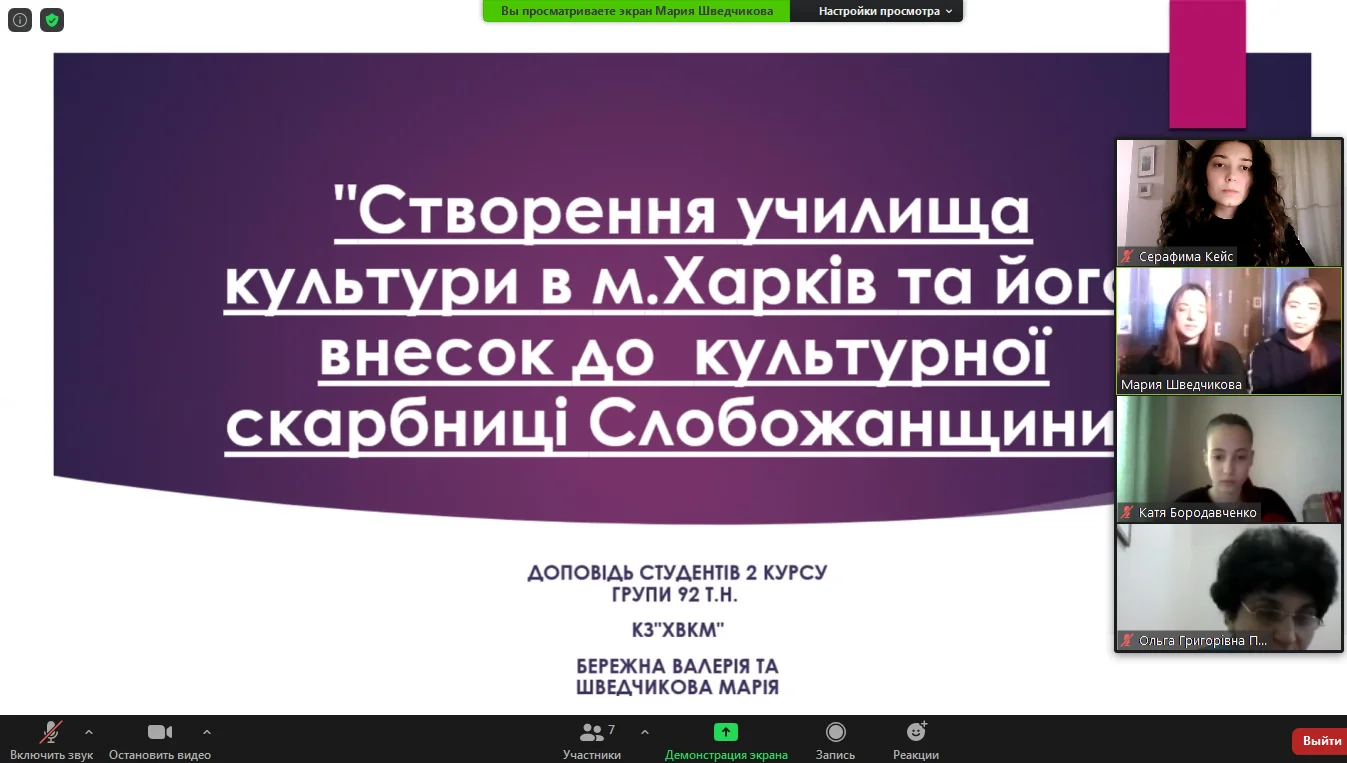 4 грудня 2020 року на історичному факультеті Харківського національного університету імені В.Н.Каразіна в онлайн-форматі відбулася XXXVIII Міжнародна краєзнавча конференція молодих учених «Краєзнавство та краєзнавці: досвід минулого та сьогоденні завдання (до 120-річчя від дня народження професора А.Г.Слюсарського)». У конференції взяли участь студентки спеціальності «Хореографія»: Валерія Бережна та Марія Шведчикова «Створення Харківського училища культури та його внесок до культурної скарбниці Слобожанщини» (керівник – кандидат історичних наук, викладач І.М.Скирда), Катерина Бородавченко «Внесок Наталії Дудинської у світовий балет» (керівник – викладач С.С.Селегєєв), Вікторія Будовська «Пам’ятники видатним діячам культури та мистецтва у місті Харкові» (керівник – викладач С.С.Селегєєв). Вітаємо з успішною участю та бажаємо подальших досягнень!