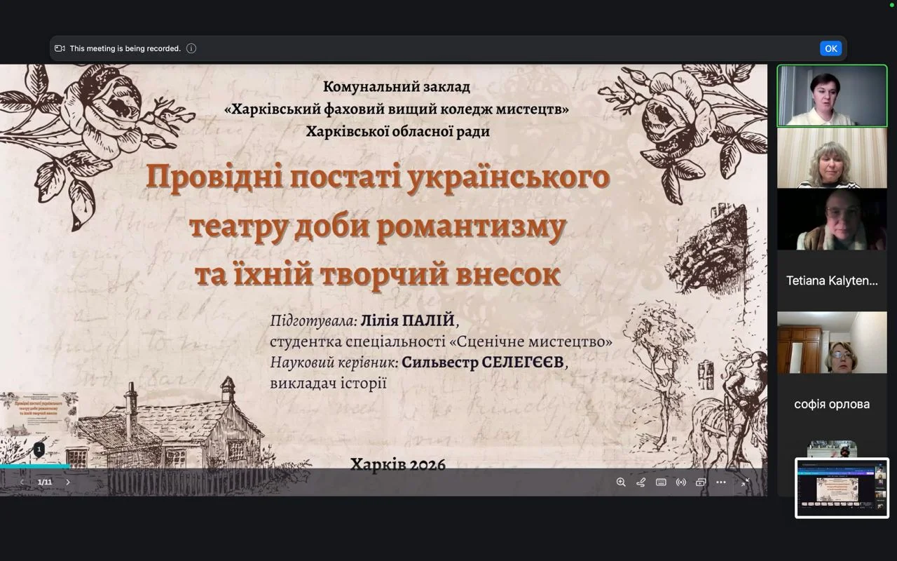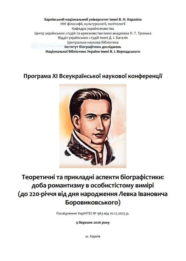 2026 рокуСьогодні у Харківському національному університеті імені В.Н.Каразіна відбулася Всеукраїнська наукова конференція «Теоретичні та прикладні аспекти біографістики: доба романтизму в особистісному вимірі (до 220-річчя від дня народження Левко Іванович Боровиковський)». У межах наукового заходу студенти коледжу представили низку дослідницьких доповідей, присвячених різним аспектам українського романтизму в мистецтві.