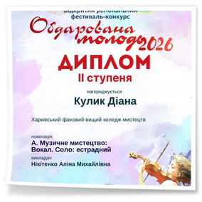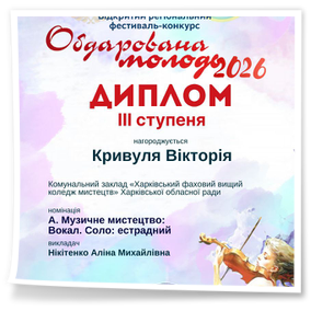 2026 рокуВітаємо здобувачів освіти ОПП «Народне пісенне мистецтво та хорове диригування» Капустян Марію, Кулик Діану та Кривулю Вікторію (керівник Нікітенко А.М.) – лауреатів регіонального фестивалю-конкурсу мистецтв «Обдарована молодь» та бажаємо подальших творчих звершень!