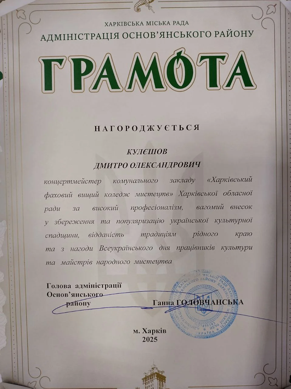 2025 рокуНапередодні Всеукраїнського дня працівників культури та майстрів народного мистецтва в Основ’янському районі відбулася чудова урочиста подія! Це свято стало щирою нагодою подякувати тим, хто щодня своєю працею звеличує рідну Україну та примножує силу духу нашого народу. Особливо приємно відзначити, що серед нагороджених був наш колега Дмитро Кулешов, концертмейстер Коледжу! Його було відзначено Грамотою адміністрації Основ’янського району Харківської міської ради за плідну працю та високий професіоналізм, відданість традиціям рідного краю та з нагоди професійного свята! Щиро вітаємо пана Дмитра! Бажаємо міцного здоров’я, родинного затишку, творчої наснаги та визнання в улюбленій справі!