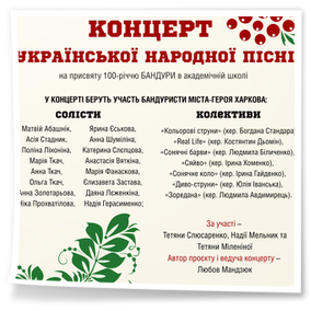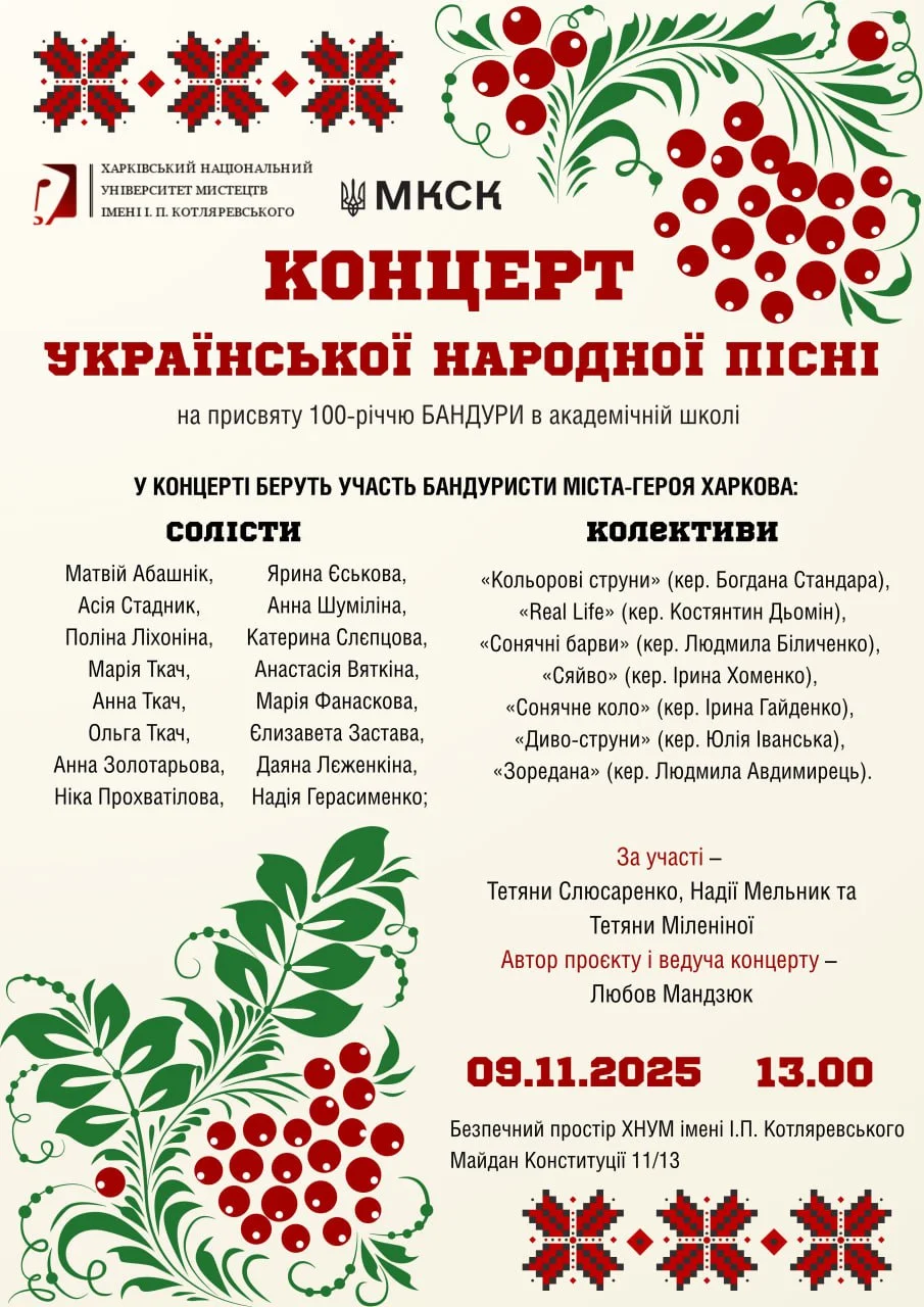 2025 рокуСьогодні, 9 листопада, у гостинній залі Харківського національного університету мистецтв імені І.П.Котляревського відбулася знакова подія – концерт української народної пісні, присвячений 100-річчю бандури в академічній школі. Цей мистецький вечір став справжнім святом української душі, пісні та традицій. У концерті взяли участь здобувачі освіти мистецьких навчальних закладів різних рівнів Харківщини.
