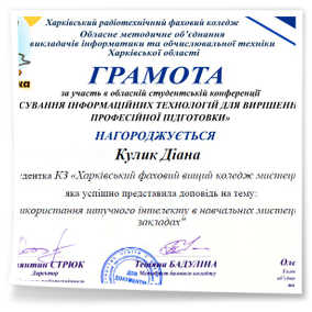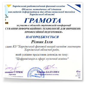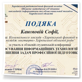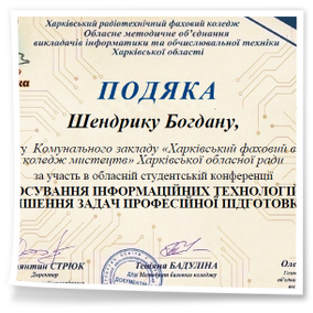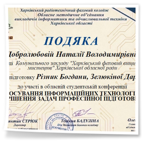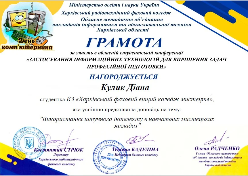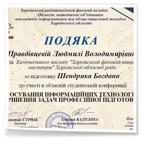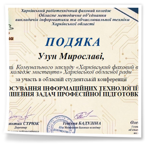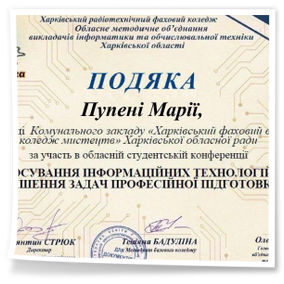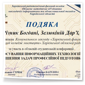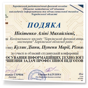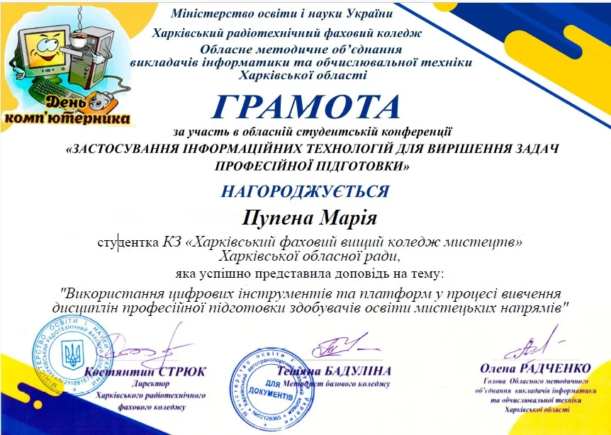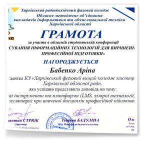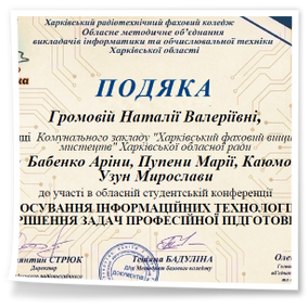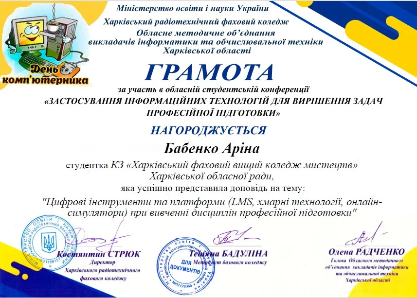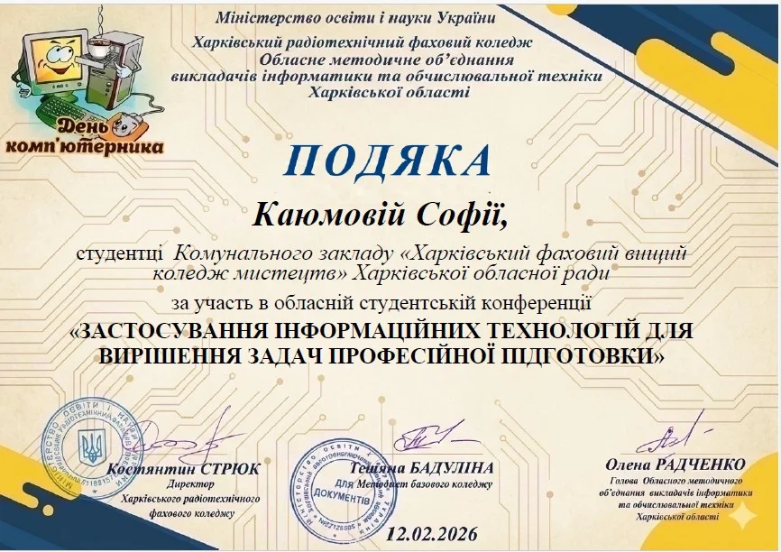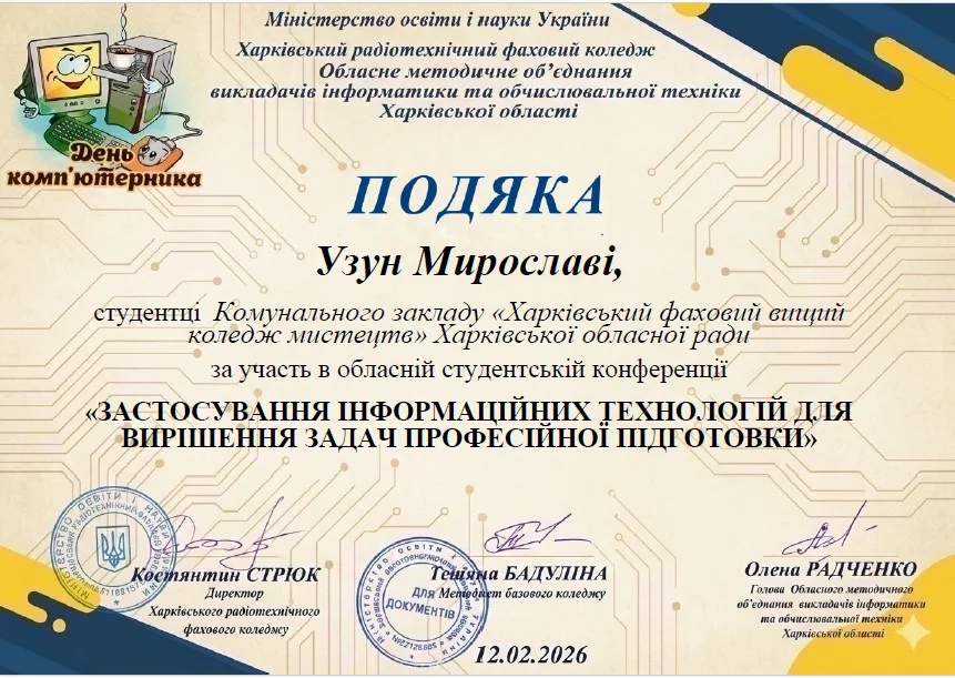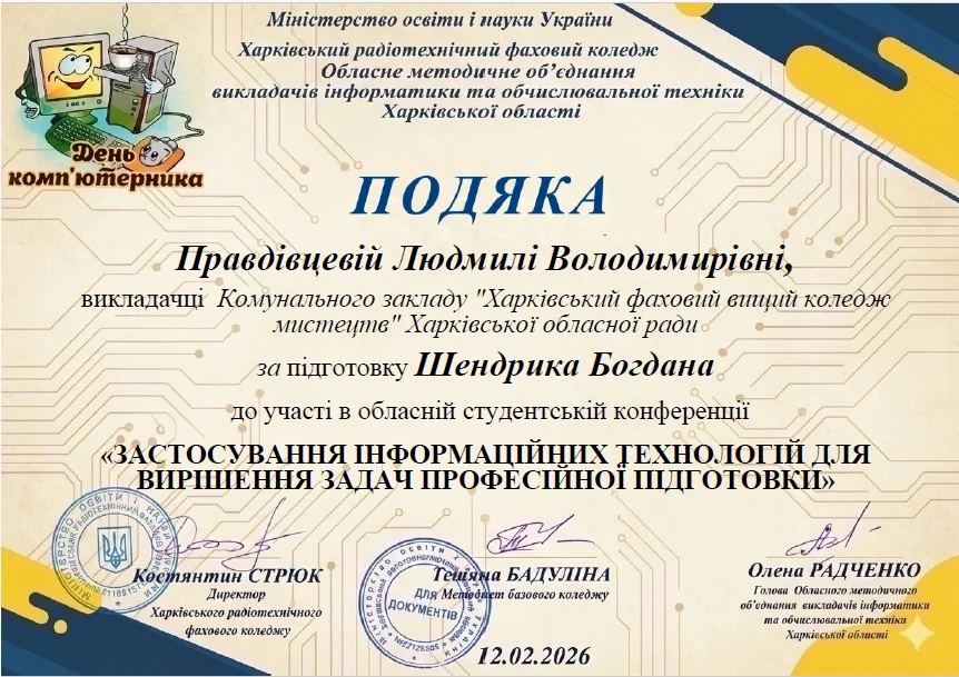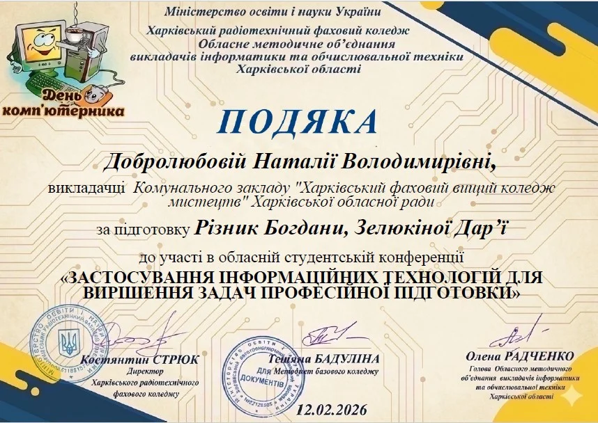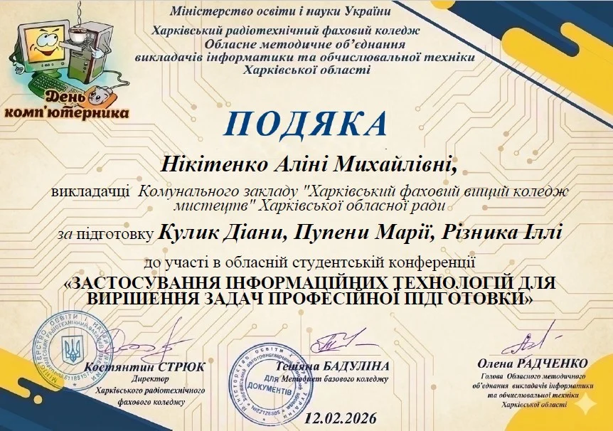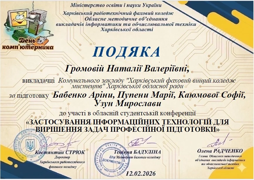 2026 рокуВітаємо студентів коледжу з отриманням Грамот та Подяк за виступ із доповідями та написання тезів у збірник конференції до Дня комп’ютерника «Застосування інформаційних технологій для вирішення задач професійної підготовки»: Бабенко Аріну, Зелюкіну Дар’ю, Каюмову Софію, Кулик Діану, Пупену Марію, Різник Богдану, Різник Іллю, Узун Мирославу, Шендрик Богдана. Викладачі Громова Н.В., Добролюбова Н.В., Нікітенко А.В. та Правдівцева Л.В. отримали Подяки за підготовку студентів до конференції. Особливо відмітили виступ Бабенко Аріни, яка під керівництвом Громової Наталії Валеріївни представила роботу «Топ 25 історичних дат, які має знати кожен українець» – інтерактивну презентацію із гіперпосиланнями.