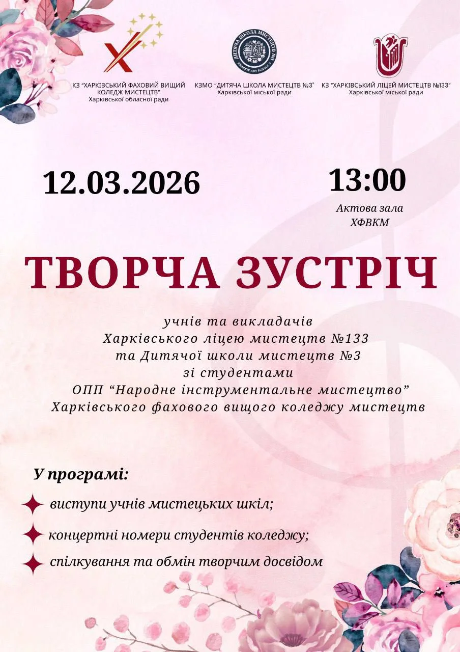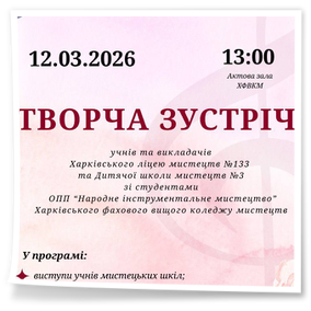 2026 рокуСьогодні у стінах Харківського фахового вищого коледжу мистецтв відбулася Творча зустріч здобувачів освіти ОПП «Народне інструментальне мистецтво» Коледжу з учнями відділів народних інструментів початкових мистецьких закладів міста Харкова – Харківського ліцею мистецтв №133 та Дитячої школи мистецтв №3. Концерт став справжнім святом Музики, що об’єднав учнів і студентів в одну єдину творчу родину. Юні музиканти та студенти Коледжу полонили слухачів своїми емоційними та натхненими виступами. Такі зустрічі доводять – народно-інструментальне мистецтво в Харкові живе, розвивається та звучить на повний голос. Дякуємо викладачам і концертмейстерам мистецьких закладів за невтомну працю, бажаємо творчих злетів під мирним небом України та чекаємо на нові зустрічі!