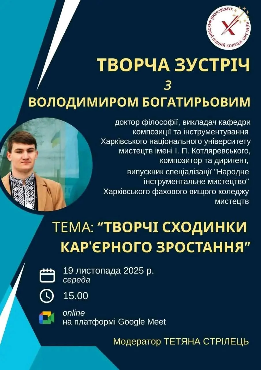 2025 рокуСьогодні для здобувачів освіти освітньо-професійної програми «Народне інструментальне мистецтво» Харківського фахового вищого коледжу мистецтв відбулася онлайн зустріч з випускником нашого навчального закладу 2015 року доктором філософії, викладачем кафедри композиції та інструментування ХНУМ імені І.П.Котляревського, композитором та диригентом Володимиром Богатирьовим на тему: «Творчі сходинки кар’єрного зростання».