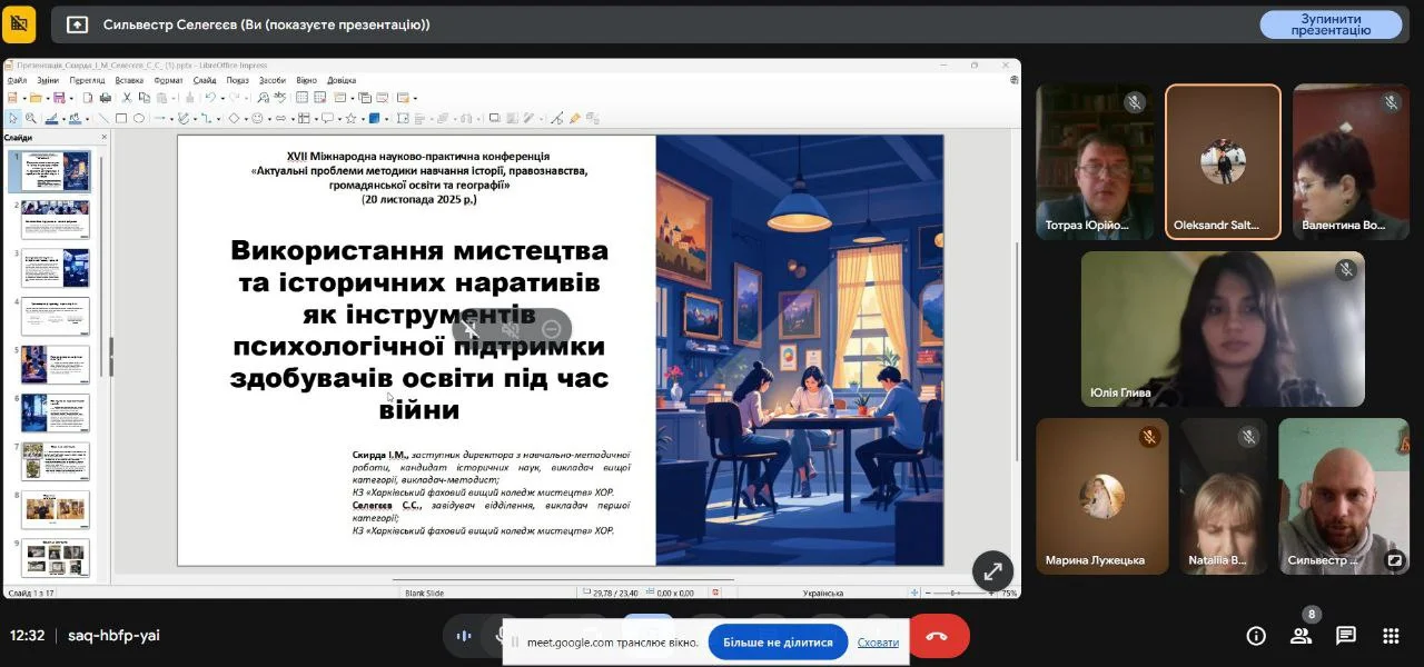 2025 року20 листопада 2025 року в Харківському національному педагогічному університеті імені Г.С.Сковороди відбулася ХVІІ Міжнародна науково-практична конференція «Актуальні проблеми методики навчання історії, правознавства, громадянської освіти та географії». Учасниками заходу стали науковці, викладачі та педагоги-практики з різних регіонів України, які обговорили сучасні виклики та інноваційні підходи в освітньому процесі. У конференції взяли участь викладачі історії та соціально-економічних дисциплін коледжу.