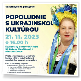 2025 рокуСьогодні Україна була представлена на престижному мистецько-освітньому заході «Afternoon with Ukrainian culture» (укр. «Полудень з українською культурою»), організованому Інститутом менеджменту культури і туризму, культурології та етнології факультету філософії Університету Костянтина Філософа у місті Нітра (Словаччина). Подію проведено у рамках грантового проєкту «Трудова міграція з Румунії, Сербії та України до Словаччини та її культурні та соціальні наслідки».