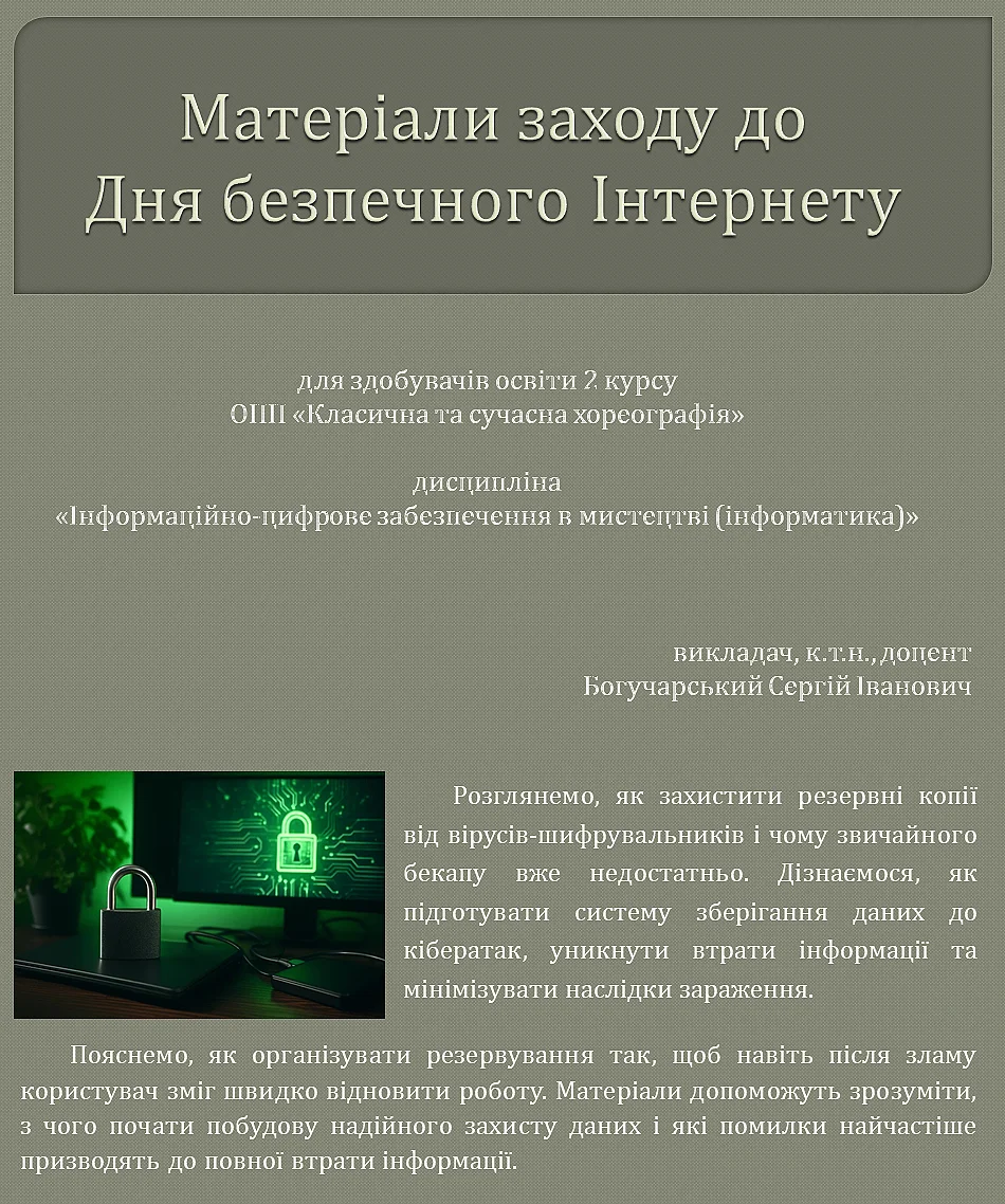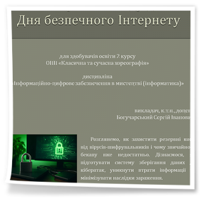 2026 рокуУпродовж трьох тижнів лютого 2026 року в коледжі відбувалися заходи до Дня безпечного інтернету. В межах навчальної дисципліни «Інформатика» обговорювалися шляхи безпечного використання цифрових технологій. Зокрема, проведена бесіда «Підліток в онлайн-просторі: свобода чи небезпека» для здобувачів освіти першого курсу ОПП «Народна хореографія» (викладач Н.Ярковська); тематичне заняття «Резервні копії проти шифрувальників: як правильно підготовувати бекапи» для здобувачів освіти другого курсу ОПП «Класична та сучасна хореографія» (викладач, к.т.н., доцент С.І.Богучарський); презентацію з коментарями «Захист особистості в цифровому світі» провів викладач Є.Шарий для здобувачів освіти другого курсу ОПП «Видовищно-театралізовані заходи». Викладач А.Нікітенко підготувала здобувачів освіти других курсів для участі у студентській конференції «Застосування інформаційних технологій для вирішення задач професійної підготовки», яка відбулася у межах Обласного методичного об’єднання викладачів інформатики та обчислювальної техніки Харківської області на базі фахового радіотехнічного коледжу у місті Харкові 12 лютого 2026 року. Із доповідями виступили Різник Ілля, Пупена Марія – «Використання цифрових інструментів та платформ у процесі вивчення дисциплін професійної підготовки здобувачів освіти мистецьких напрямів»; Кулик Діана – «Використання штучного інтелекту в навчальних мистецьких закладах».