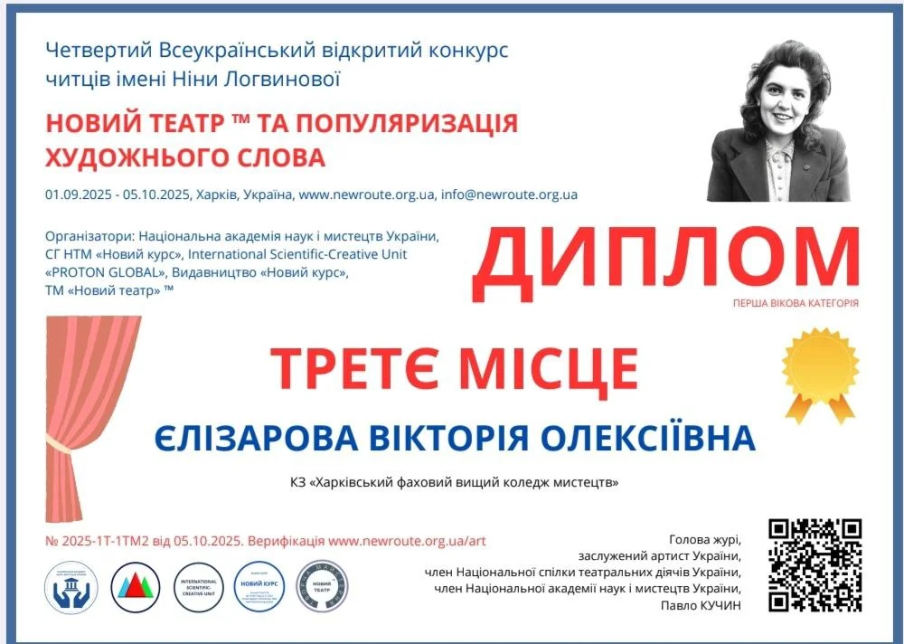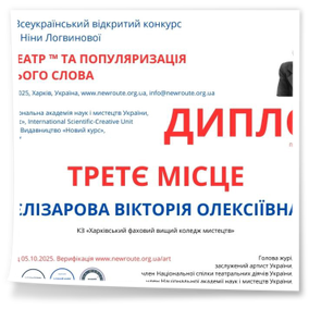 2025 рокуВітаємо Єлізарову Вікторію, студентку 4 курсу спеціальності «Сценічне мистецтво» з перемогою (диплом лауреата III ступеня) у IV Всеукраїнському відкритому конкурсі читців імені Ніни Логвинової «Новий театр та популяризація художнього слова», який відбувся у місті Харкові з 1 вересня по 5 жовтня 2025 року в дистанційному форматі.