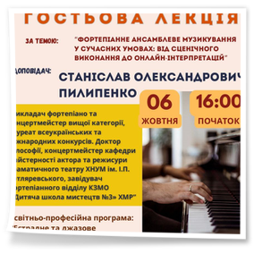 2025 року6 жовтня 2025 року відбулася гостьова лекція Станіслава Олександровича Пилипенко – викладача фортепіано та концертмейстера вищої категорії, лауреата всеукраїнських та міжнародних конкурсів, доктора філософії, концертмейстера кафедри майстерності актора та режисури драматичного театру ХНУМ імені І. П. Котляревського, завідувача фортепіанного відділу КЗМО «Дитяча школа мистецтв №3» ХМР. Тема: «Фортепіанне ансамблеве музикування у сучасних умовах: від сценічного виконання до онлайн-інтерпретацій».