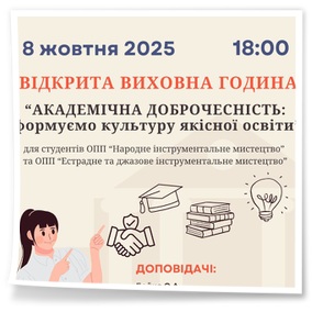 2025 року8 жовтня 2025 року відбулася відкрита виховна година для студентів освітньо-професійних програм «Народне інструментальне мистецтво» та «Естрадне та джазове інструментальне мистецтво» на тему: «Академічна доброчесність: формуємо культуру якісної освіти». Під час зустрічі керівник груп 2 курсу Бойко О.А. та керівник групи 3 курсу Колуканова Л.С. ознайомили студентів із основними принципами академічної доброчесності, наголосили на важливості чесності, відповідальності та поваги в освітньому процесі. У ході обговорення учасники розглянули практичні приклади дотримання етичних норм у навчальній діяльності та творчих проєктах, обмінялися думками щодо шляхів формування культури якісної освіти в сучасному мистецькому середовищі. Такі заходи сприяють підвищенню свідомості студентів, формуванню активної громадянської позиції та розвитку професійної відповідальності майбутніх митців.